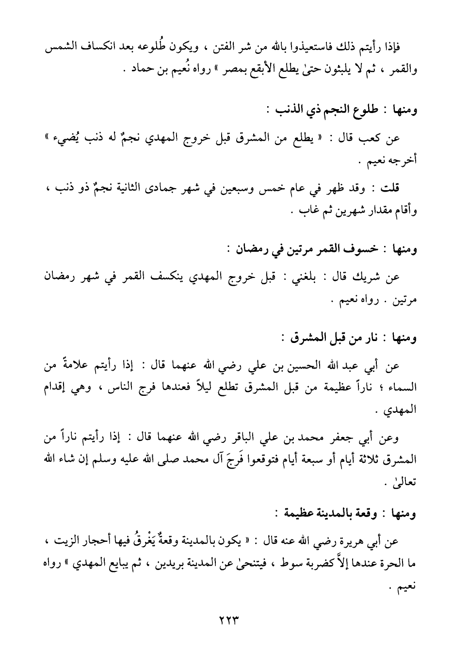 عن أبي عبد الله الحسين بن علي رضي الله عنهما قال: إذا رأيتم علامةً من السماء؛ نارًا عظيمة من قبل المشرق تطلع ليلًا فعندها فرج الناس، وهي إقدام المهدي.