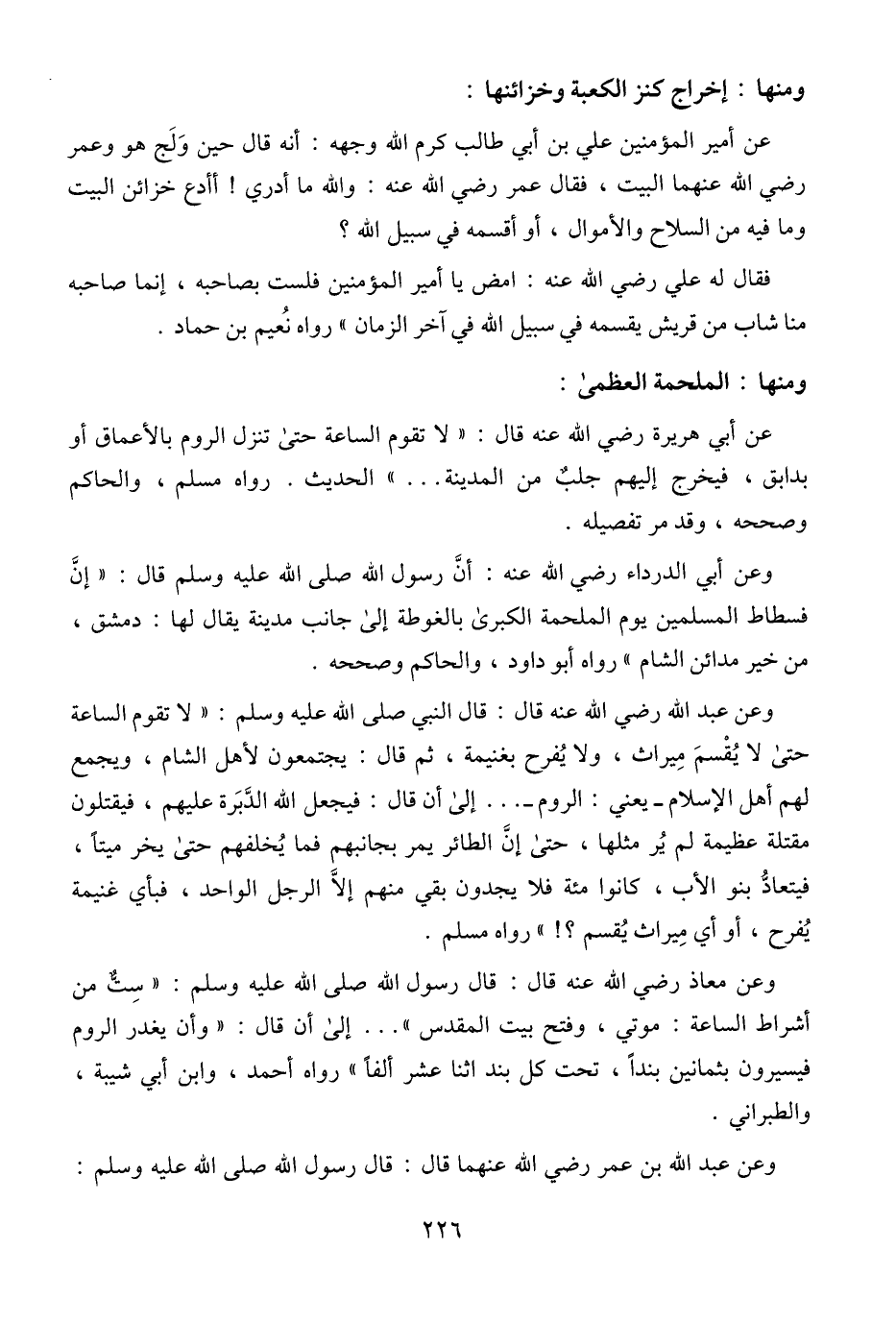 فقال له علي - رضي الله عنه -: "امض يا أمير المؤمنين فلست بصاحبه، إنما صاحبه منا شاب من قريش يقسمه في سبيل الله في آخر الزمان" رواه نُعيم بن حماد.
