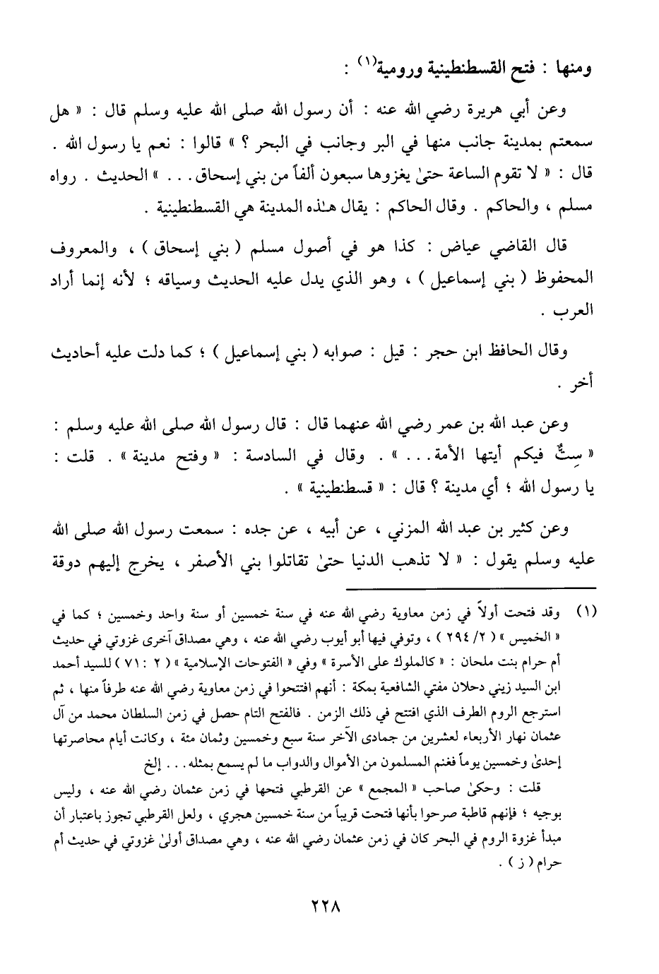 (¬1) وقد فتحت أولًا في زمن معاوية - رضي الله عنه - في سنة خمسين أو سنة واحد وخمسين؛ كما في "الخميس" (2/ 294)، وتوفي فيها أبو أيوب - رضي الله عنه -، وهي مصداق آخرى غزوتي في حديث أم حرام بنت ملحان: "كالملوك على الأسرة" وفي "الفتوحات الإسلامية" (2: 71) للسيد أحمد ابن السيد زيني دحلان مفتي الشافعية بمكة: أنهم افتتحوا في زمن معاوية - رضي الله عنه - طرفًا منها، ثم استرجع الروم الطرف الذي افتتح في ذلك الزمن. فالفتح التام حصل في زمن السلطان محمد من آل عثمان نهار الأربعاء لعشرين من جمادى الآخر سنة سبع وخمسين وثمان مئة، وكانت أيام محاصرتها إحدى وخمسين يومًا فغنم المسلمون من الأموال والدواب ما لم يسمع بمثله ... إلخ