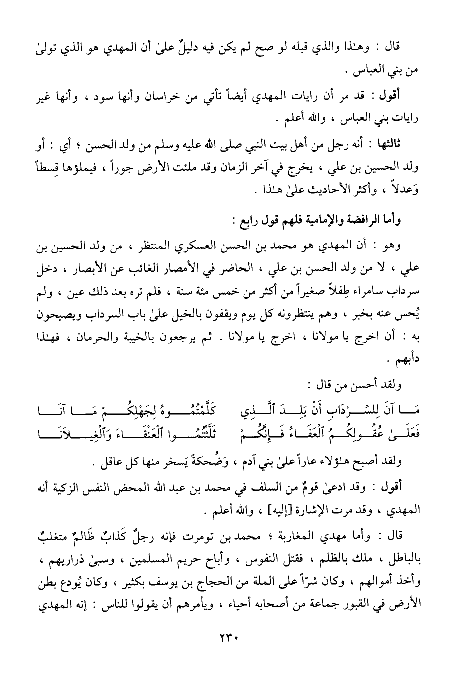 وهو: أن المهدي هو محمد بن الحسن العسكري المنتظر، من ولد الحسين بن علي، لا من ولد الحسن بن علي، الحاضر في الأمصار الغائب عن الأبصار، دخل سرداب سامراء طِفلًا صغيرًا من أكثر من خمس مئة سنة، فلم تره بعد ذلك عين، ولم يُحس عنه بخبر، وهم ينتظرونه كل يوم ويقفون بالخيل على باب السرداب ويصيحون به: أن اخرج يا مولانا، اخرج يا مولانا. ثم يرجعون بالخيبة والحرمان، فهذا دأبهم.