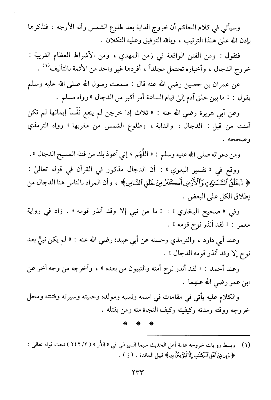 والكلام عليه يأتي في مقامات في اسمه ونسبه ومولده وحليته وسيرته وفتنته ومحل خروجه ووقته ومدته وكيفيته وكيف النجاة منه ومن يقتله.