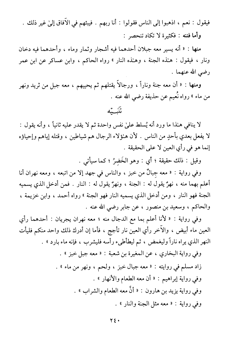 ومنها: "أن معه جنة ونارًا، ورجالًا يقتلهم ثم يحييهم، معه جبل من ثريد ونهر من ماء" رواه نُعيم عن حذيفة - رضي الله عنه -.