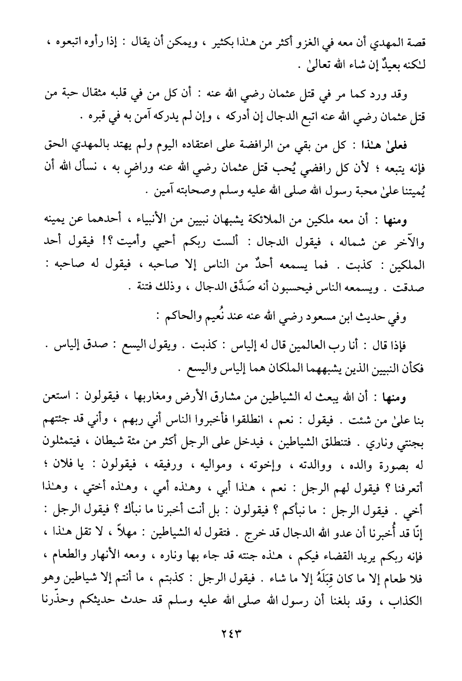 وقد ورد كما مر في قتل عثمان - رضي الله عنه -: أن كل من في قلبه مثقال حبة من قتل عثمان - رضي الله عنه - اتبع الدجال إن أدركه، وإن لم يدركه آمن به في قبره.