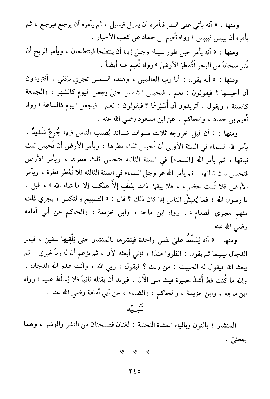 ومنها: "أنه يأتي على النهر فيأمره أن يسيل فيسيل، ثم يأمره أن يرجع فيرجع، ثم يأمره أن ييبس فييبس" رواه نُعيم بن حماد عن كعب الأحبار.