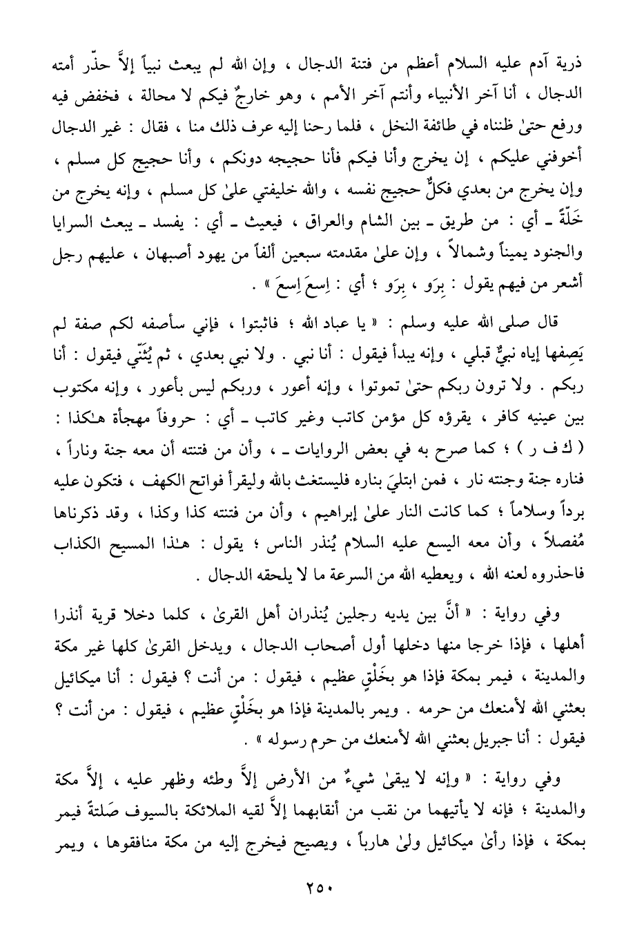 ذرية آدم عليه السلام أعظم من فتنة الدجال، وإن الله لم يبعث نبيًا إلَّا حذر أمته الدجال، أنا آخر الأنبياء وأنتم آخر الأمم، وهو خارجٌ فيكم لا محالة، فخفض فيه ورفع حتى ظَنَنَّاه في طائفة النخل، فلما رحنا إليه عرف ذلك منا، فقال: غير الدجال أخوفني عليكم، إن يخرج وأنا فيكم فأنا حجيجه دونكم، وأنا حجيج كل مسلم، وإن يخرج من بعدي فكلٌّ حجيج نفسه، والله خليفتي على كل مسلم، وإنه يخرج من خَلّةً -أي: من طريق- بين الشام والعراق، فيعيث -أي: يفسد- يبعث السرايا والجنود يمينًا وشمالًا، وإن على مقدمته سبعين ألفًا من يهود أصبهان، عليهم رجل أشعر من فيهم يقول: بِرَو، بِرَو؛ أي: اِسعَ اِسعَ".