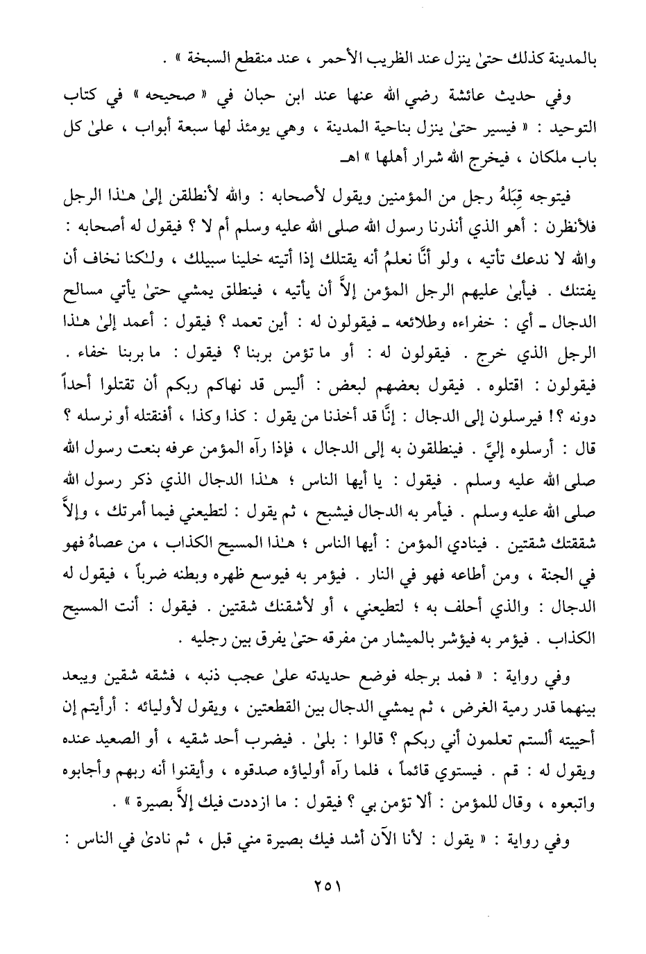 فيتوجه قِبَلهُ رجل من المؤمنين ويقول لأصحابه: والله لأنطلقن إلى هذا الرجل فلأنظرن: أهو الذي أنذرنا رسول الله - صلى الله عليه وسلم - أم لا؟ فيقول له أصحابه: والله لا ندعك تأتيه، ولو أنَّا نعلمُ أنه يقتلك إذا أتيته خلينا سبيلك، ولكنا نخاف أن يفتنك. فيأبى عليهم الرجل المؤمن إلَّا أن يأتيه، فينطلق يمشي حتى يأتي مسالح الدجال -أي: خفراءه وطلائعه- فيقولون له: أين تعمد؟ فيقول: أعمد إلى هذا الرجل الذي خرج. فيقولون له: أو ما تؤمن بربنا؟ فيقول: ما بربنا خفاء. فيقولون: اقتلوه. فيقول بعضهم لبعض: أليس قد نهاكم ربكم أن تقتلوا أحدًا دونه؟ ! فيرسلون إلى الدجال: إنَّا قد أخذنا من يقول: كذا وكذا، أفنقتله أو نرسله؟ قال: أرسلوه إليَّ. فينطلقون به إلى الدجال، فإذا رآه المؤمن عرفه بنعت رسول الله - صلى الله عليه وسلم -. فيقول: يا أيها الناس؛ هذا الدجال الذي ذكر رسول الله - صلى الله عليه وسلم -. فيأمر به الدجال فيشبح، ثم يقول: لتطيعني فيما أمرتك، وإلَّا شققتك شقتين. فينادي المؤمن: أيها الناس؛ هذا المسيح الكذاب، من عصاهُ فهو في الجنة، ومن أطاعه فهو في النار. فيؤمر به فيوسع ظهره وبطنه ضربًا، فيقول له الدجال: والذي أحلف به؛ لتطيعني، أو لأشقنك شقتين. فيقول: أنت المسيح الكذاب. فيؤمر به فيؤشر بالميشار من مفرقه حتى يفرق بين رجليه.