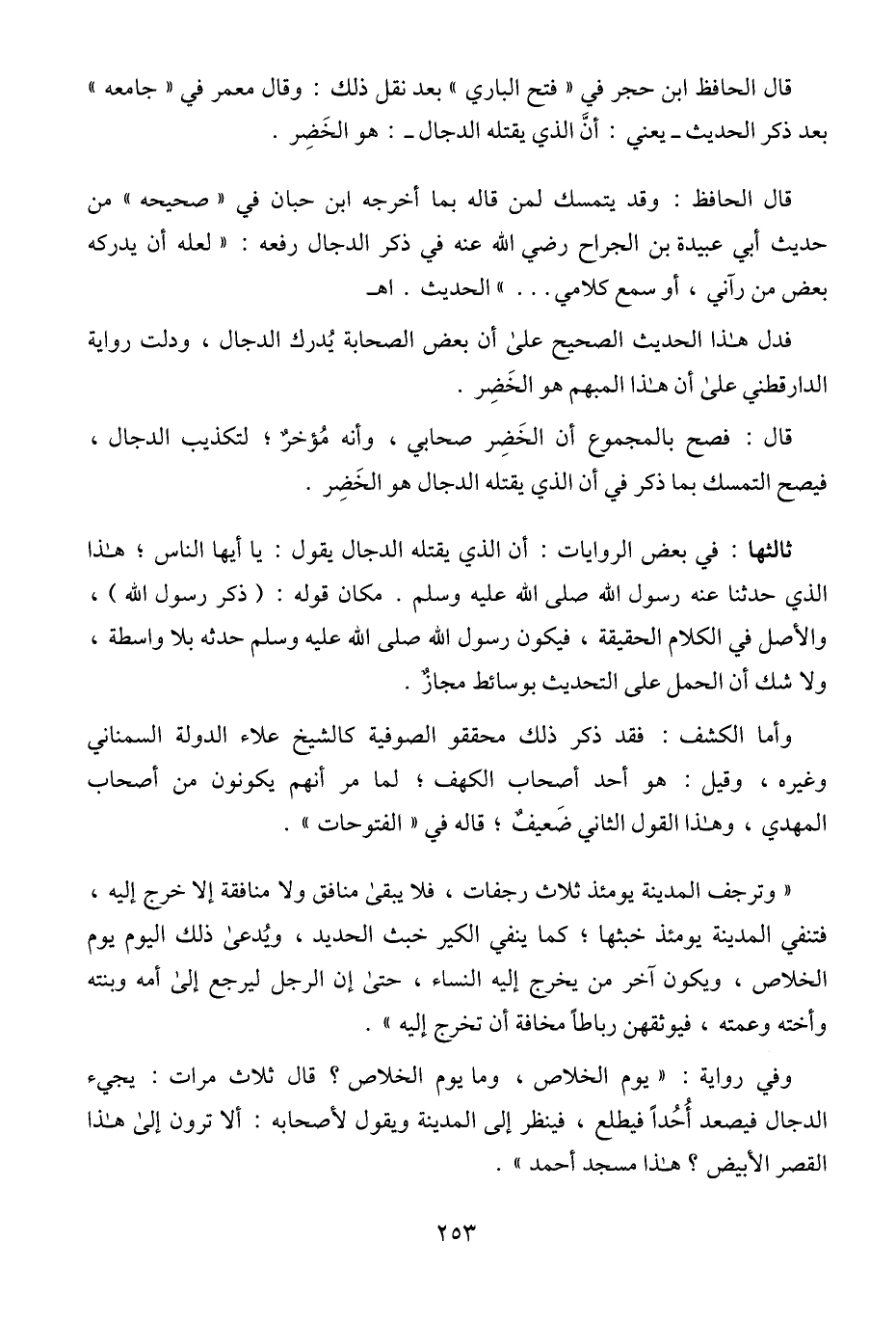 قال: فصح بالمجموع أن الخَضِر صحابي، وأنه مُؤخرٌ؛ لتكذيب الدجال، فيصح التمسك بما ذكر في أن الذي يقتله الدجال هو الخَضِر.