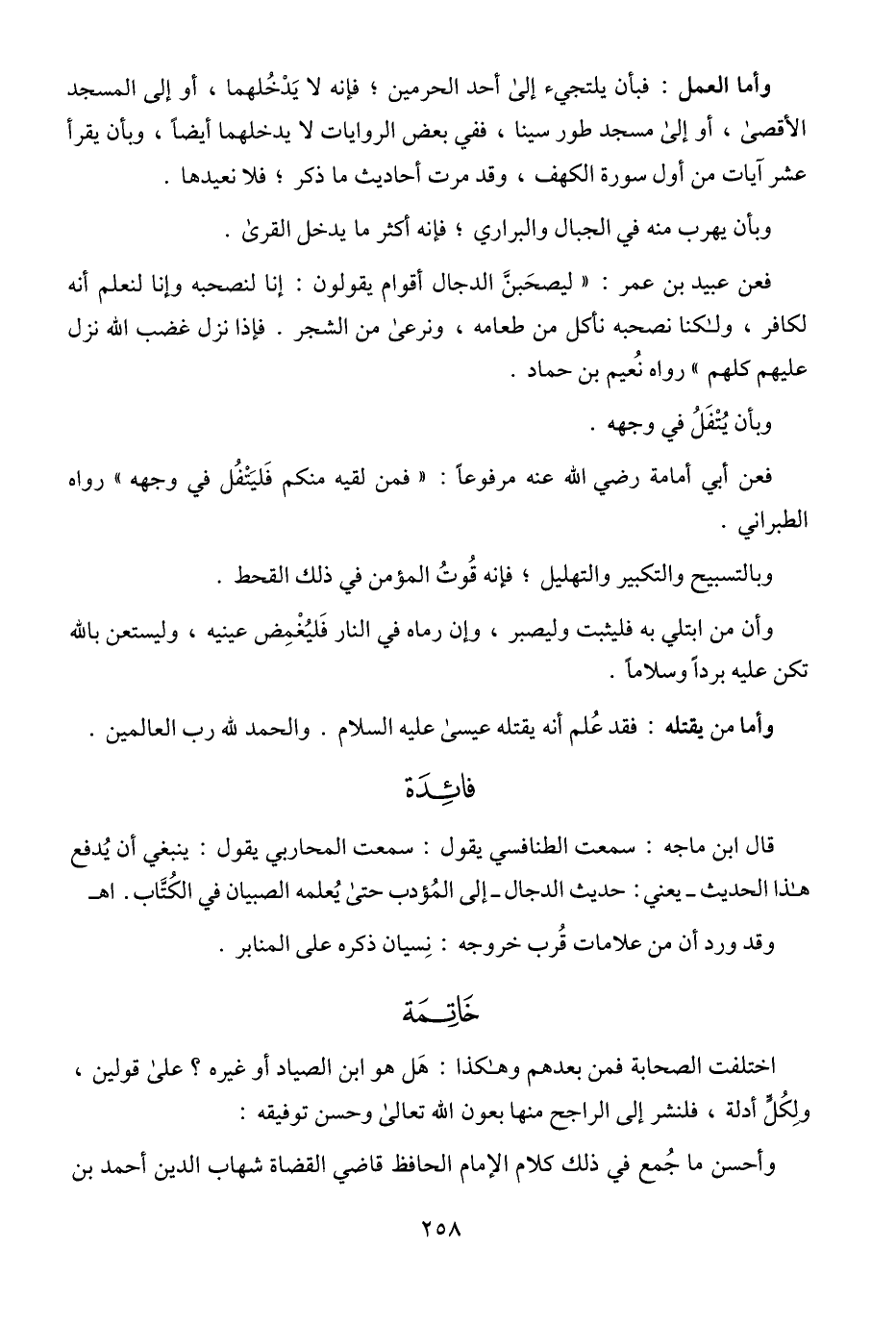 وأما العمل: فبأن يلتجيء إلى أحد الحرمين؛ فإنه لا يَدْخُلهما، أو إلى المسجد الأقصى، أو إلى مسجد طور سينا، ففي بعض الروايات لا يدخلهما أيضًا، وبأن يقرأ عشر آيات من أول سورة الكهف، وقد مرت أحاديث ما ذكر؛ فلا نعيدها.