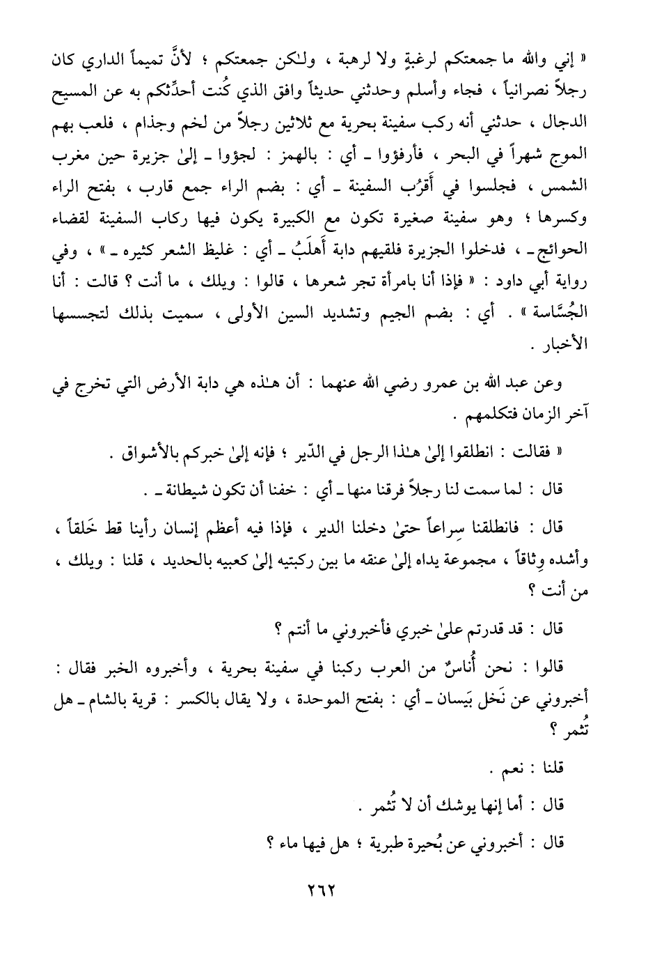 "إني والله ما جمعتكم لرغبةٍ ولا لرهبة، ولكن جمعتكم؛ لأنَّ تميمًا الداري كان رجلًا نصرانيًا، فجاء وأسلم وحدثني حديثًا وافق الذي كُنت أحدِّثكم به عن المسيح الدجال، حدثني أنه ركب سفينة بحرية مع ثلاثين رجلًا من لخم وجذام، فلعب بهم الموج شهرًا في البحر، فأرفؤوا -أي: بالهمز: لجؤوا- إلى جزيرة حين مغرب الشمس، فجلسوا في أَقرُب السفينة -أي: بضم الراء جمع قارب، بفتح الراء وكسرها؛ وهو سفينة صغيرة تكون مع الكبيرة يكون فيها ركاب السفينة لقضاء الحوائج-، فدخلوا الجزيرة فلقيهم دابة أَهلَبُ -أي: غليظ الشعر كثيره-"، وفي رواية أبي داود: "فإذا أنا بامرأة تجر شعرها، قالوا: ويلك، ما أنت؟ قالت: أنا الجُسَّاسة". أي: بضم الجيم وتشديد السين الأولى، سميت بذلك لتجسسها الأخبار.