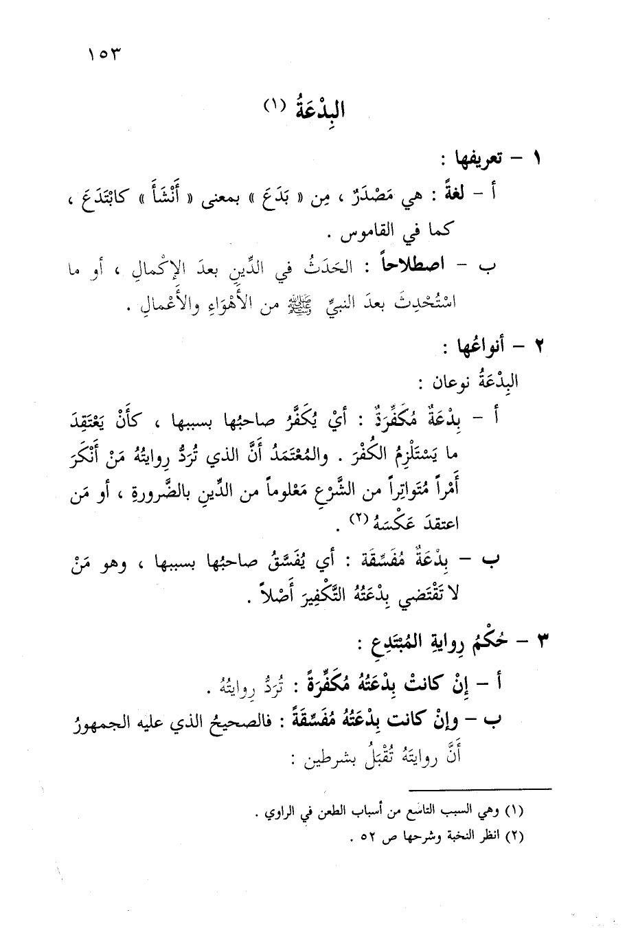 أ- بدعة مكفرة: أي يكفر صاحبها بسببها، كأن يعتقد ما يستلزم الكفر. والمعتمد أن الذي ترد روايته من أنكر أمرا متواترا من الشرع معلوما من الدين بالضرورة، أو من اعتقد عكسه2.