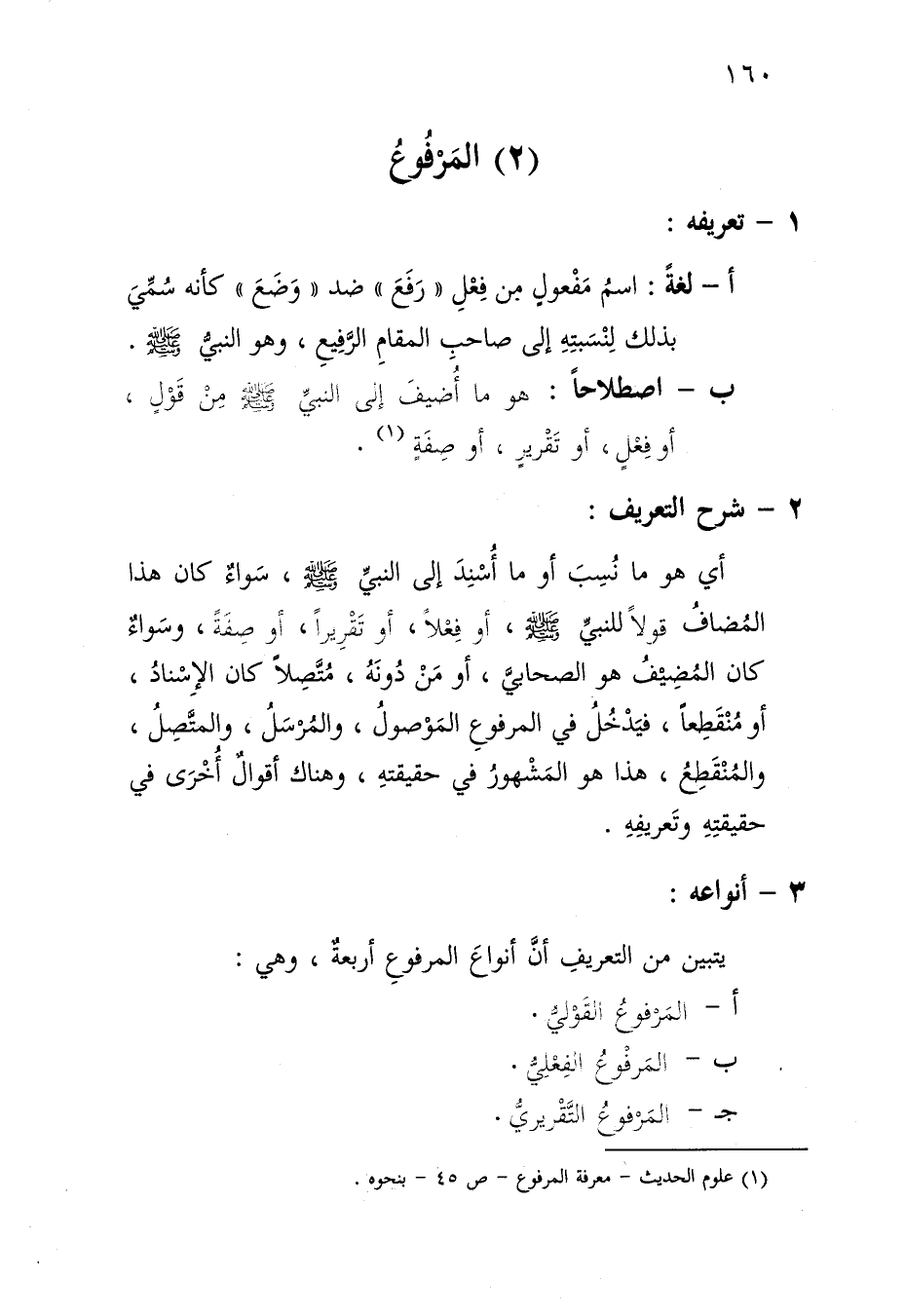 أي هو ما نسب أو ما أسند إلى النبي صلى الله عليه وسلم، وسواء كان هذا المضاف قولا للنبي صلى الله عليه وسلم، أو فعلا، أو تقريرا، أو صفة، وسواء كان المضيف هو الصحابي، أو من دونه، متصلًا كان الإسناد، أو منقطعًا، فيدخل في المرفوع الموصول، والمرسل، والمتصل، والمنقطع، هذا هو المشهور في حقيقته، وهناك أقوال أخرى في حقيقته وتعريفه.