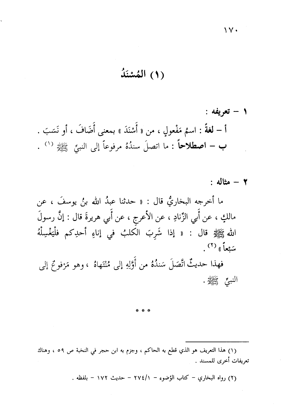 1 هذا التعريف هو الذي قطع به الحاكم، وجزم به ابن حجر في النخبة ص59، وهناك تعريفات أخرى للمسند.