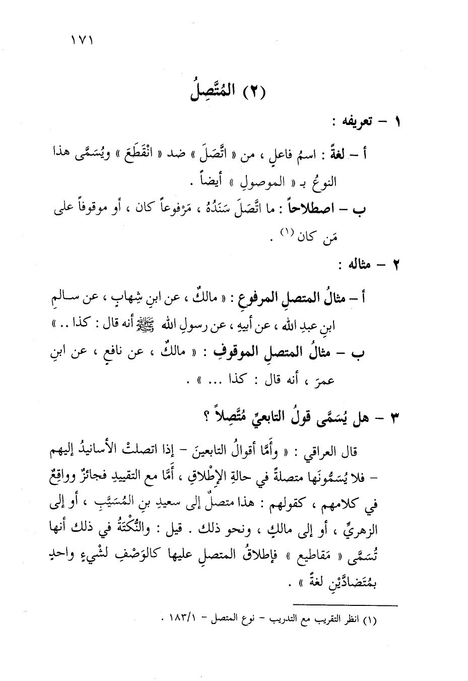 أ- مثال المتصل المرفوع: "مالك، عن ابن شهاب، عن سالم بن عبد الله، عن أبيه، عن رسول الله صلى الله عليه وسلم أنه قال: كذا ... "