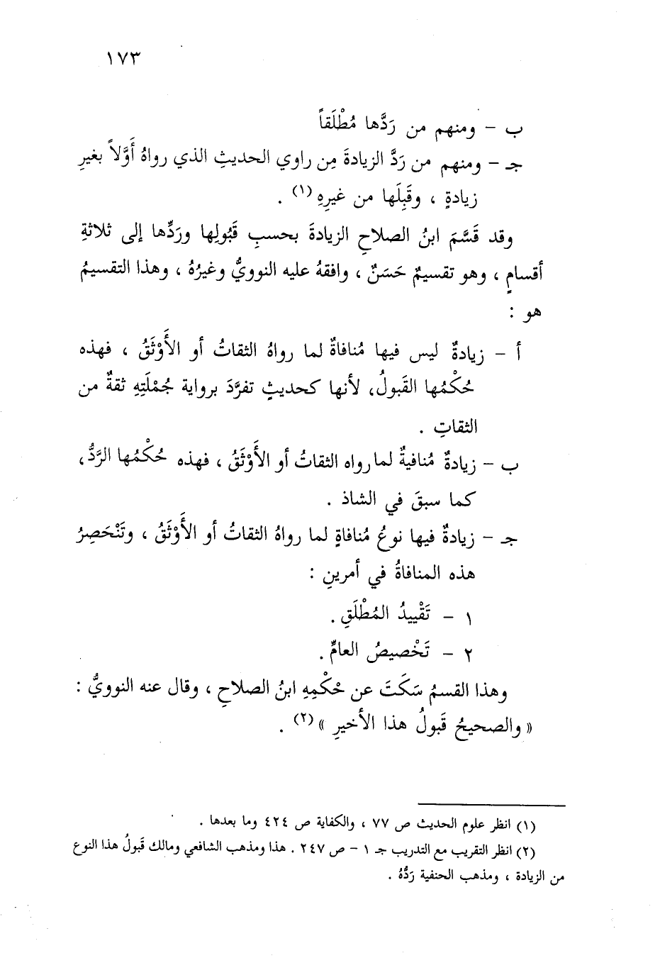 2 انظر التقريب مع التدريب ج1، ص247. هذا ومذهب الشافعي ومالك قبول هذا النوع من الزيادة، ومذهب الحنفية رَدُّهُ.