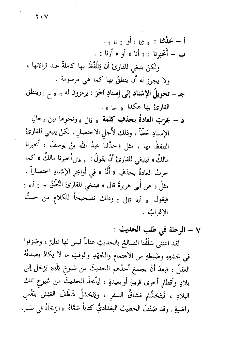 د- جرت العادة بحذف كلمة "قال" ونحوها بين رجال الإسناد خطًّا، وذلك لأجل الاختصار، لكن ينبغي للقارئ التلفظ بها، مثل "حدثنا عبد الله بن يوسف، أخبرنا مالك" فينبغي للقارئ أن يقول: "قال: أخبرنا مالك" كما جرت العادة بحذف "أنه" في أواخر الإسناد اختصارا.