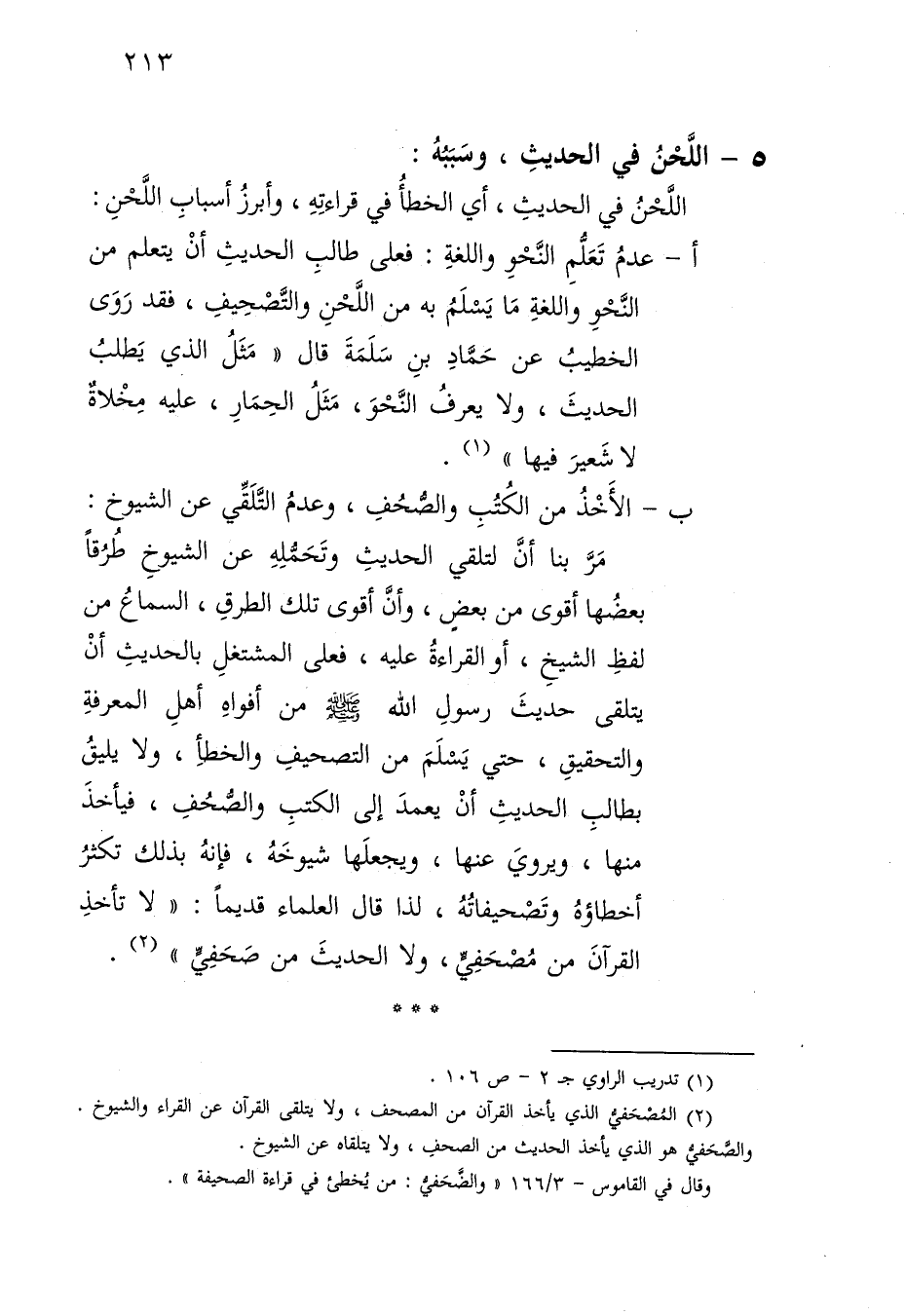 ب- الأخذ من الكتب والصحف، وعدم التلقي عن الشيوخ: مر بنا أن لتلقي الحديث وتحمله عن الشيوخ طرقًا بعضها أقوى من بعض، وأن أقوى تلك الطرق السماع من لفظ الشيخ، أو القراءة عليه، فعلى المشتغل بالحديث أن يتلقى حديث رسول الله صلى الله عليه وسلم من أفواه أهل المعرفة والتحقيق، حتى يسلم من التصحيف والخطأ، ولا يليق بطالب الحديث أن يعمد إلى الكتب والصحف، فيأخذ منها، ويروي عنها، ويجعلها شيوخه، فإنه بذلك تكثر أخطاؤه وتصحيفاته، لذا قال العلماء قديما: "لا تأخذ القرآن من مصحفيٍّ، ولا الحديث من صحفيٍّ"2.