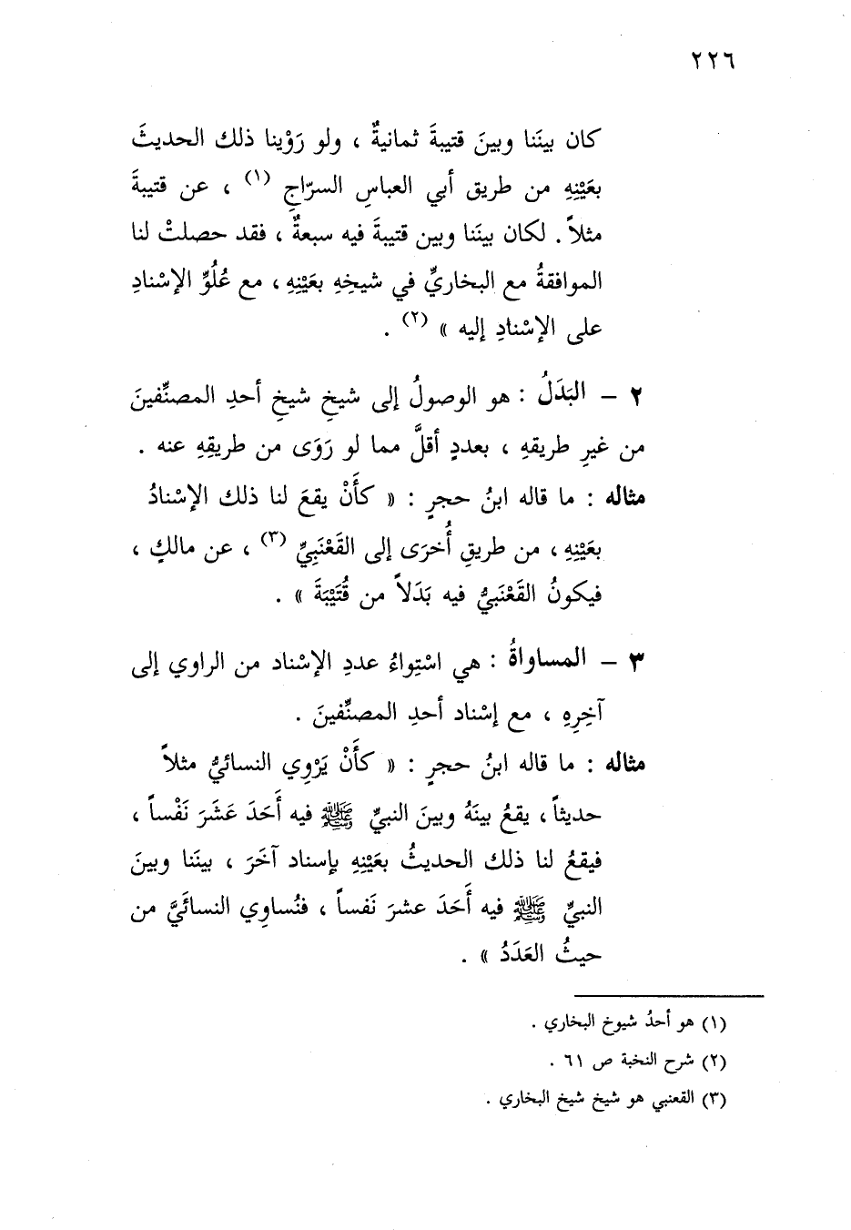 2- البدل: هو الوصول إلى شيخ شيخ أحد المصنفين من غير طريقه، بعدد أقل مما لو روى من طريقه عنه.