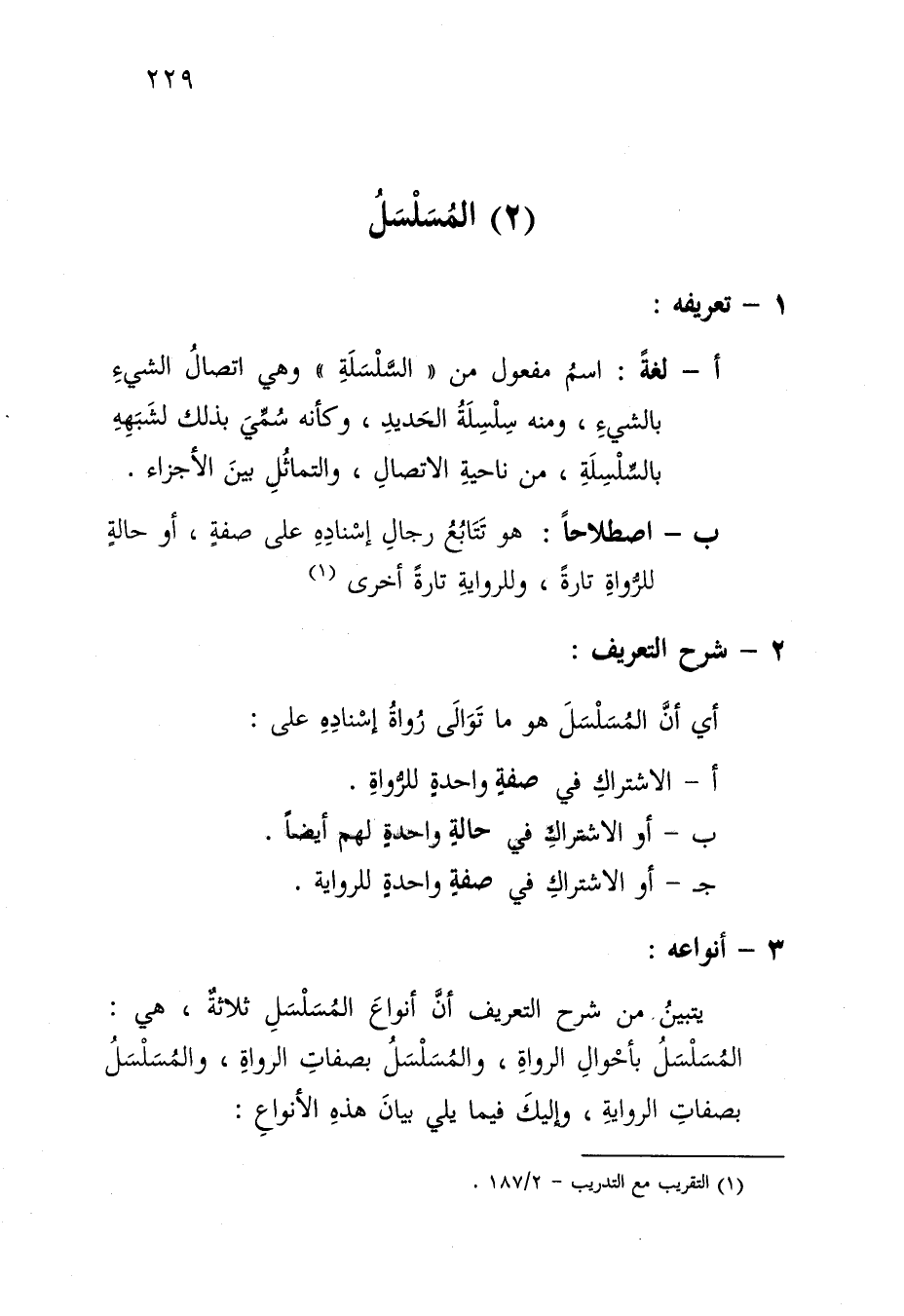 ب- اصطلاحا: هو تتابع رجال إسناده على صفة، أو حالة للرواة تارة، وللرواية تارة أخرى1.