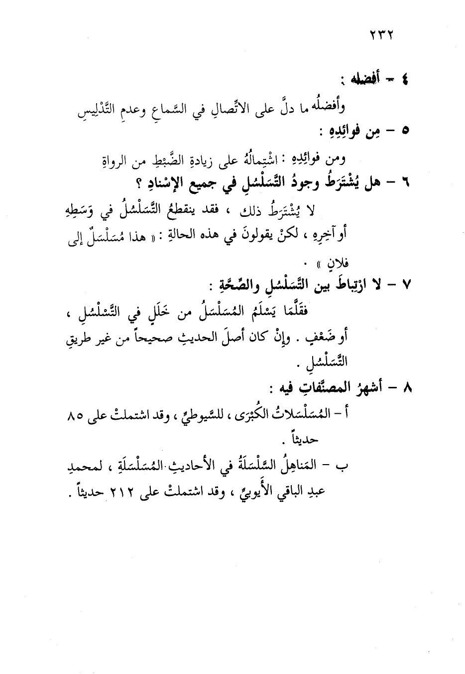 ب- المناهل السلسلة في الأحاديث المسلسلة، لمحمد عبد الباقي الأيوبي، وقد اشتملت على 212 حديثا.