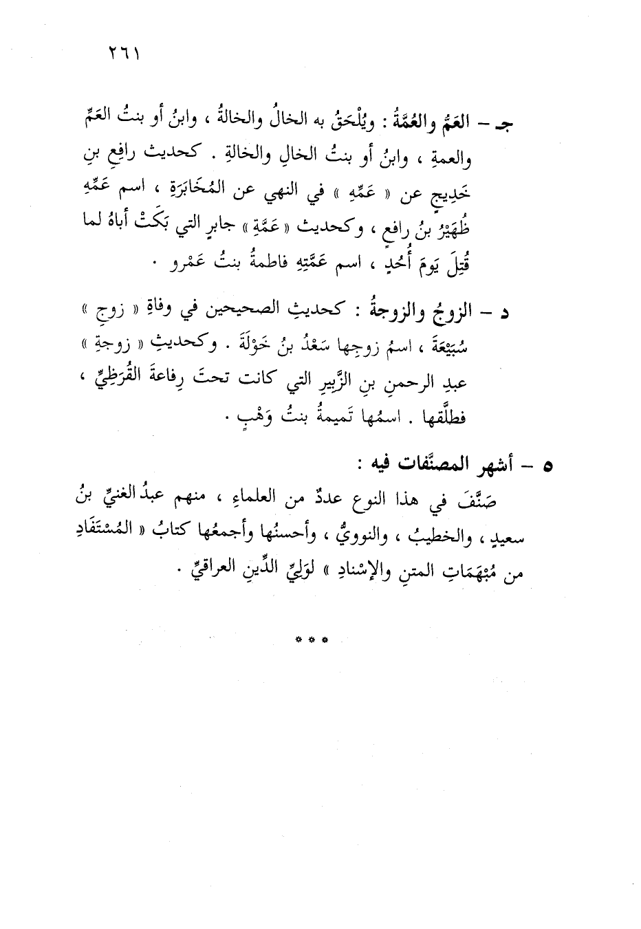 جـ- العم والعمة: ويلحق به الخال والخالة، وابن أو بنت العم والعمة، وابن أو بنت الخال والخالة؛ كحديث رافع بن خديج عن "عمه" في النهي عن المخابرة، اسم عمه ظهير بن رافع، وكحديث "عمة" جابر التي بكت أباه لما قتل يوم أحد، اسم عمته فاطمة بنت عمرو.