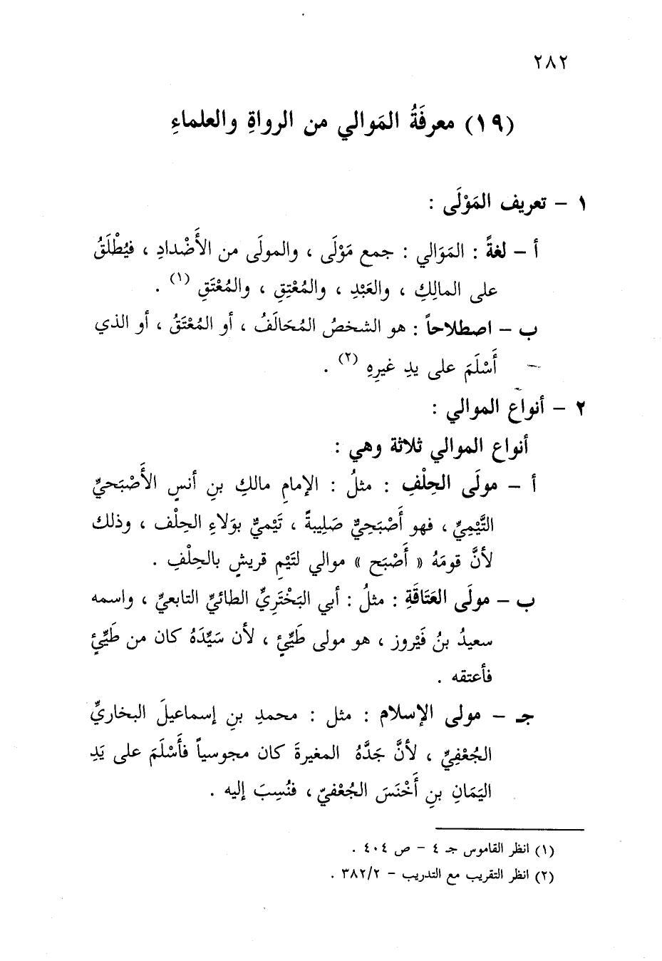 ب- مولى العتاقة: مثل: أبي البختري الطائي التابعي، واسمه سعيد بن فيروز، هو مولى طيء؛ لأن سيده كان من طييء فأعتقه.