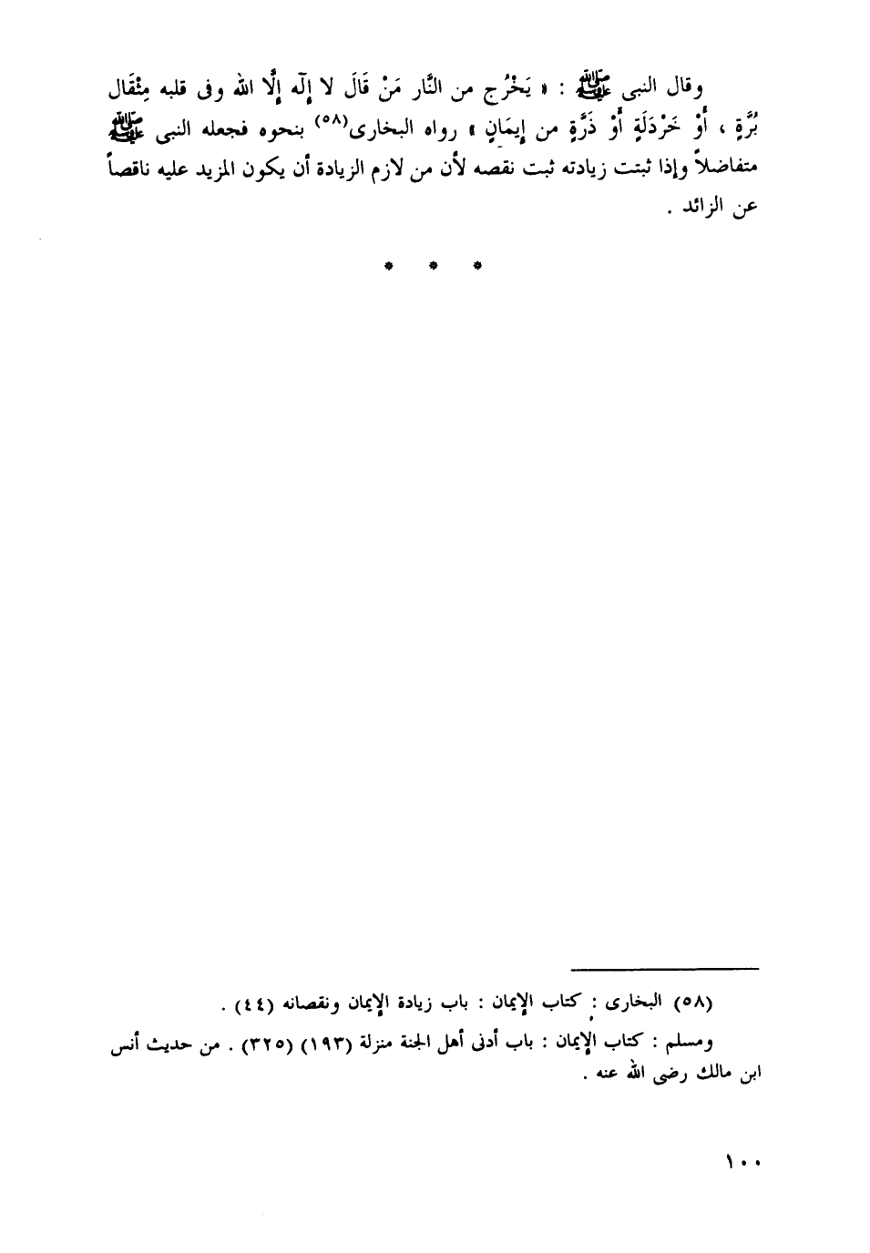وقال النبي صلى الله عليه وسلم: "يخرج من النار من قال لا إله إلا الله وفي قلبه مثقال برة، أو خردلة أو ذرة من إيمان" رواه البخاري58 بنحوه، فجعله النبي -صلى الله عليه وسلم- متفاضلاً وإذا ثبتت ثبت نقصه؛ لأن من لازم الزيادة أن يكون المزيد عليه ناقصاً عن الزائد.
