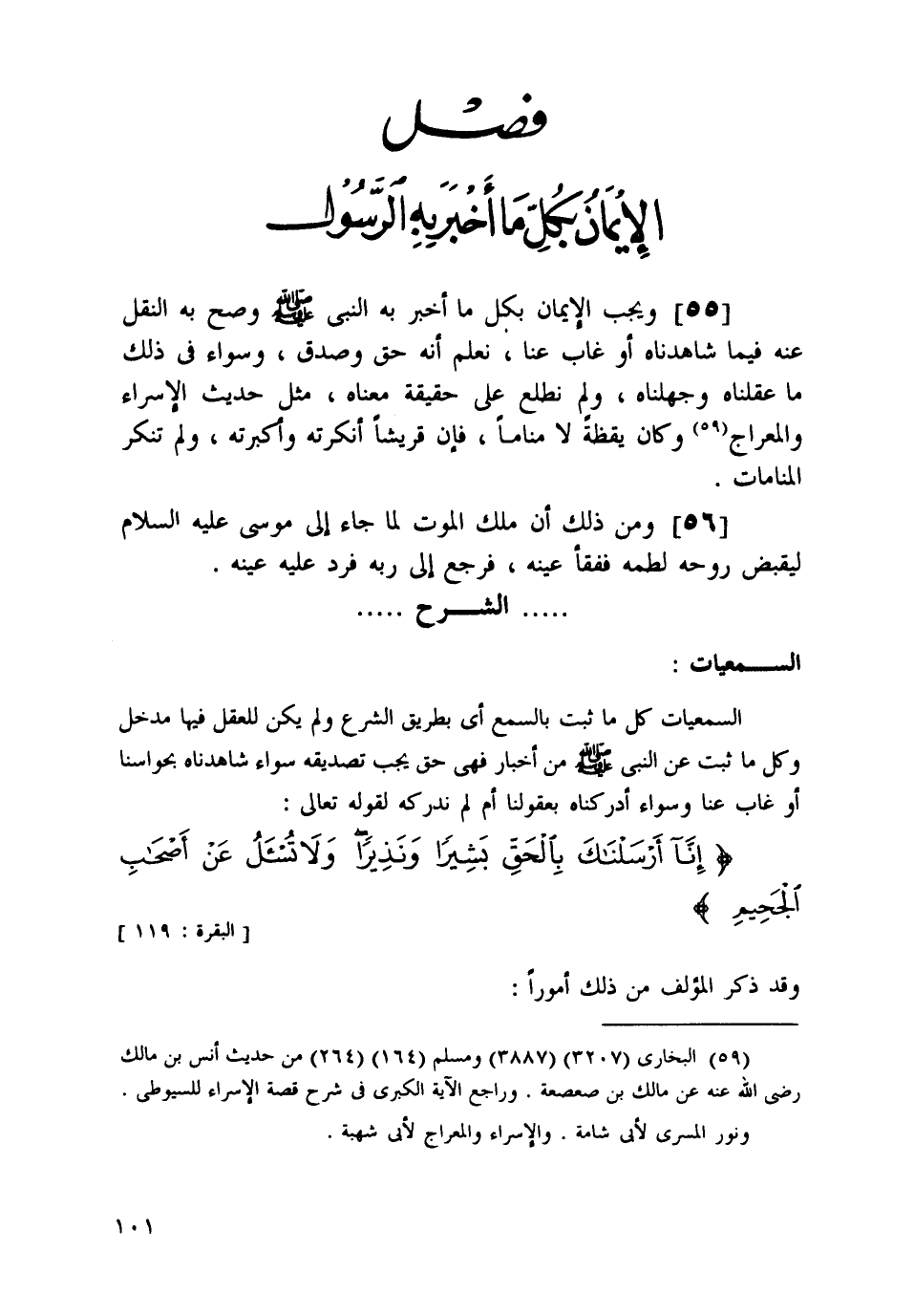 [55] ويجب الإيمان بكل ما أخبر به النبي -صلى الله عليه وسلم- وصح به النقل عنه فيما شاهدناه أو غاب عنا، نعلم أنه حق وصدق، وسواء في ذلك ما عقلناه وجهلناه، ولم نطلع على حقيقة معناه، مثل حديث الإسراء والمعراج59 وكان يقظة لا مناماً، فإن قريشاً أنكرته وأكبرته، ولم تنكر المنامات.