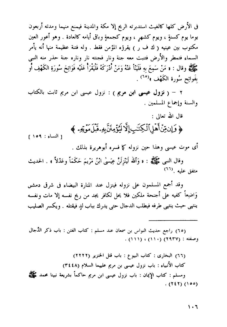 65 راجع حديث النواس بن سمعان عند مسلم: كتاب الفتن: باب ذكر الدَّجال وصفته: "2937" "110"، "111".