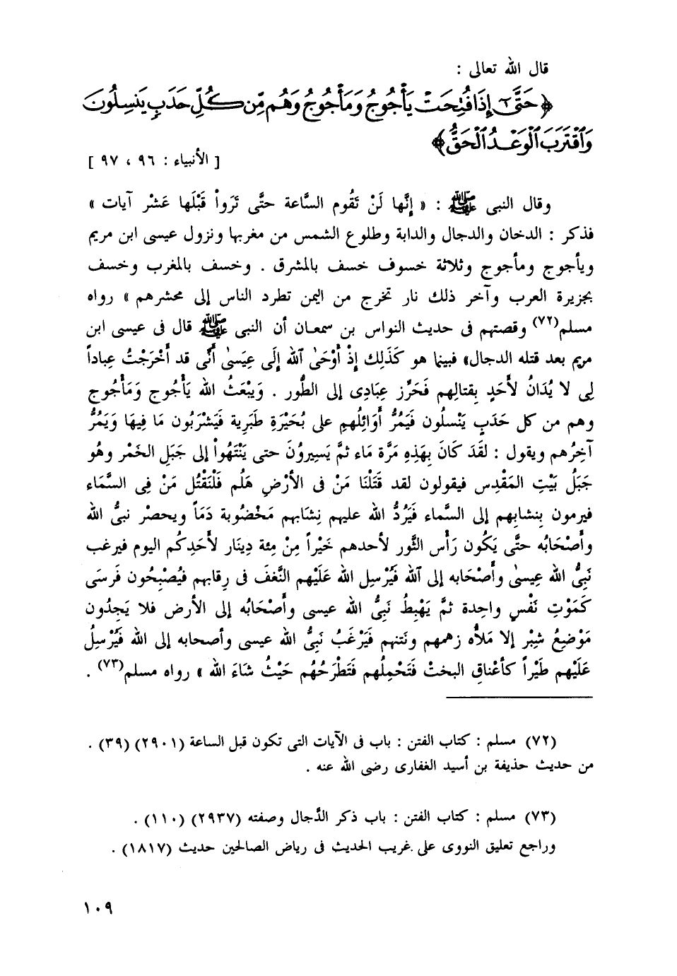 وقال النبي صلى الله عليه وسلم: "إنها لن تقوم الساعة حتى تروا قبلها عشر آيات.." فذكر الدخان والدجال والدابة وطلوع الشمس من مغربها ونزول عيسى ابن مريم ويأجوج ومأجوج وثلاثة خسوف: خسف بالمشرق، وخسف بالمغرب، وخسف بجزيرة العرب، وآخر ذلك نار تخرج من اليمن تطرد الناس إلى محشرهم. رواه مسلم72، وقصتهم في حديث النواس بن سمعان أن النبي -صلى الله عليه وسلم- قال في عيسى ابن مريم بعد قتله الدجال: "فبينما هو كذلك إذ أوحى الله إلى عيسى أني قد أخرجت عبادًا لي لا يدان لأحد بقتالهم فحرز عبادي إلى الطور، ويبعث الله يأجوج ومأجوج وهم من كل حدب ينسلون، فيمر أوائلهم على بحيرة طبرية فيشربون ما فيها ويمر آخرهم" ويقول: "لقد كان بهذه مرة ماء ثم يسيرون حتى ينتهوا إلى جبل الخمر وهو جبل بيت المقدس فيقولون: لقد قتلنا من في الأرض هلم فلنقتل من في السماء فيرمون بنشابهم إلى السماء فيرد الله عليهم نشابهم محضوبة دما، ويحصر نبي الله وأصحابه حتى يكون رأس الثور لأحدهم خيرًا من مائة دينار لأحدكم اليوم، فيرغب نبي الله عيسى وأصحابه إلى الله فيرسل الله عليهم النغف في رقابهم فيصبحون فرسى كموت نفس واحدة ثم يهبط نبي الله عيسى وأصحابه إلى الأرض فلا يجدون موضع شبر إلا ملأه زهمهم ونتنهم، فيرغب نبي الله عيسى وأصحابه إلى الله فيرسل عليهم طيرًا كأعناق البخت فتحملهم فتطرحهم حيث شاء الله" رواه مسلم73.