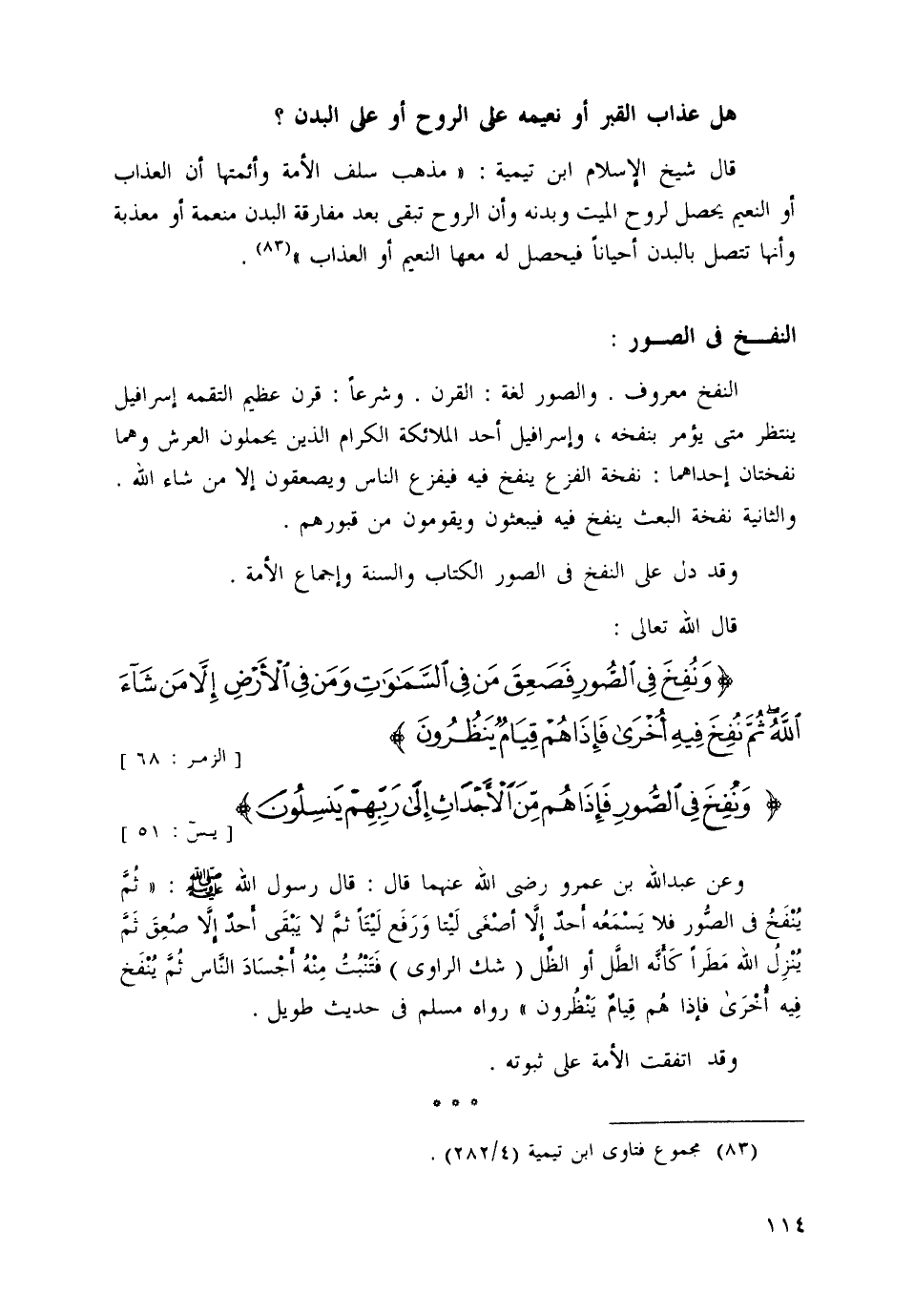 قال شيخ الإسلام ابن تيمية: مذهب سلف الأمة وأئمتها أن العذاب أو النعيم يحصل لروح الميت وبدنه، وأن الروح تبقى بعد مفارقة البدن منعمة أو معذبة، وأنها تتصل بالبدن أحيانًا فيحصل له معها النعيم أو العذاب83.