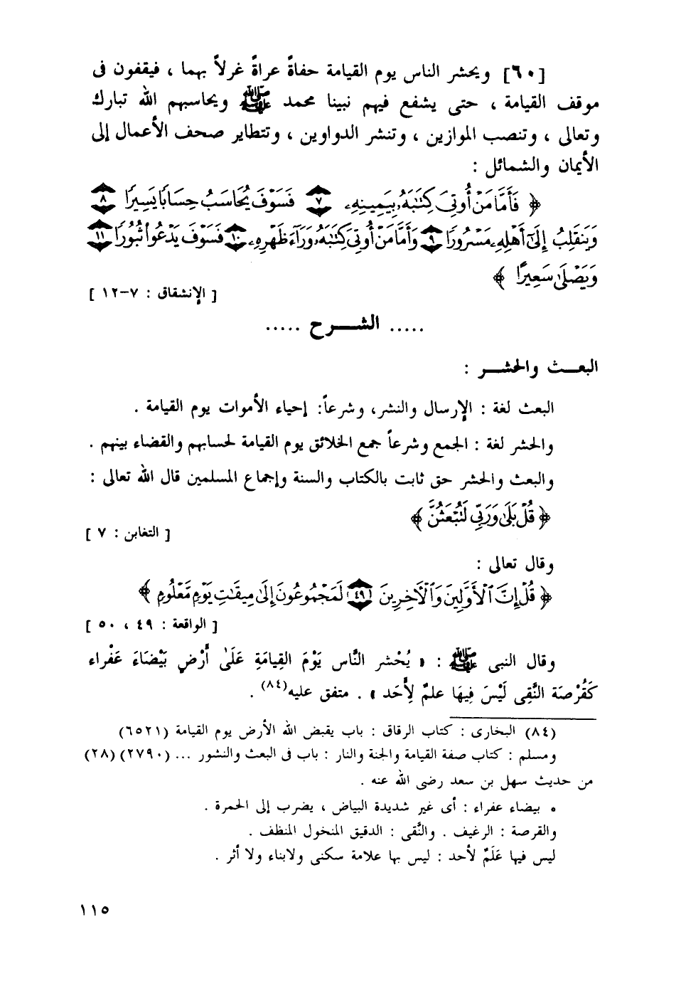 [60] ويحشر الناس يوم القيامة حفاةً عراةً غرلاً بُهْما، فيقفون في موقف القيامة، حتى يشفع، فيهم نبينا محمد -صلى الله عليه وسلم- ويحاسبهم الله تبارك وتعالى، وتنصب الموازين، وتنشر الدواوين، وتتطاير صحف الأعمال إلى الأيمان والشمائل: