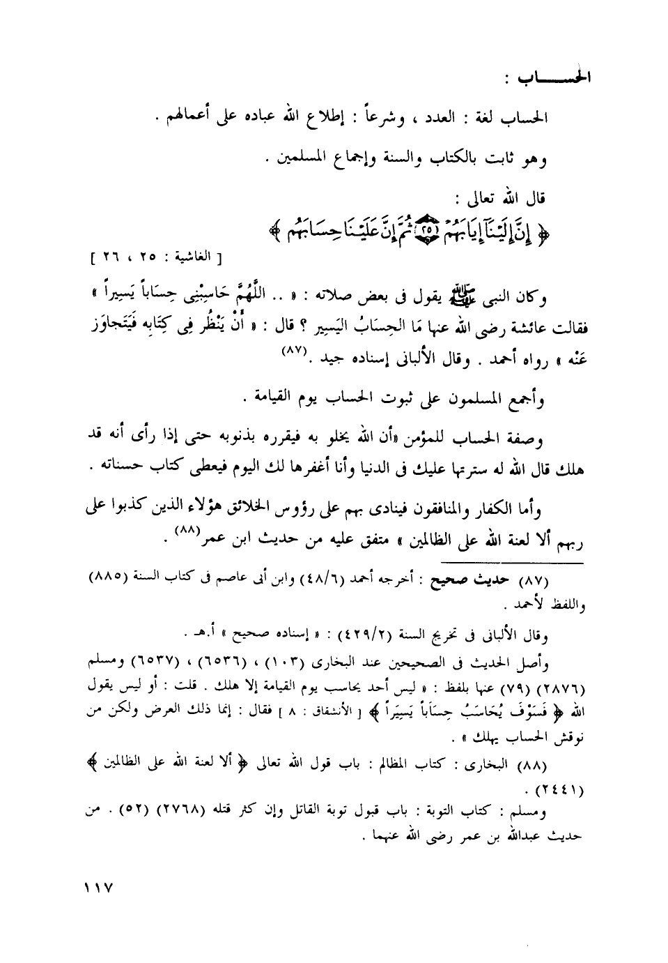 الحساب لغة: العدد، وشرعًا إطلاع الله عباده على أعمالهم.
