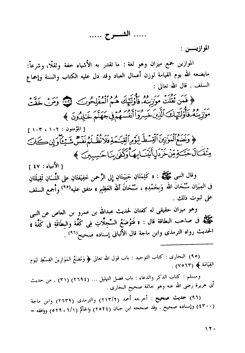 وقال النبي صلى الله عليه وسلم: "كلمتان حبيبتان إلى الرحمن خفيفتان على اللسان ثقيلتان في الميزان سبحان الله وبحمده، سبحان الله العظيم" متفق عليه95، وأجمع السلف على ثبوت ذلك.