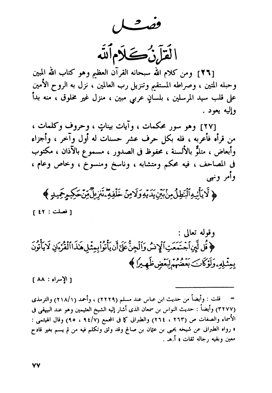 [26] ومن كلام الله سبحانه القرآن العظيم وهو كتاب الله المبين وحبله المتين، وصراطه المستقيم وتنزيل رب العالمين، نزل به الروح الأمين على قلب سيد المرسلين، بلسان عربي مبين، منزل غير مخلوق، منه بدأ وإليه يعود.