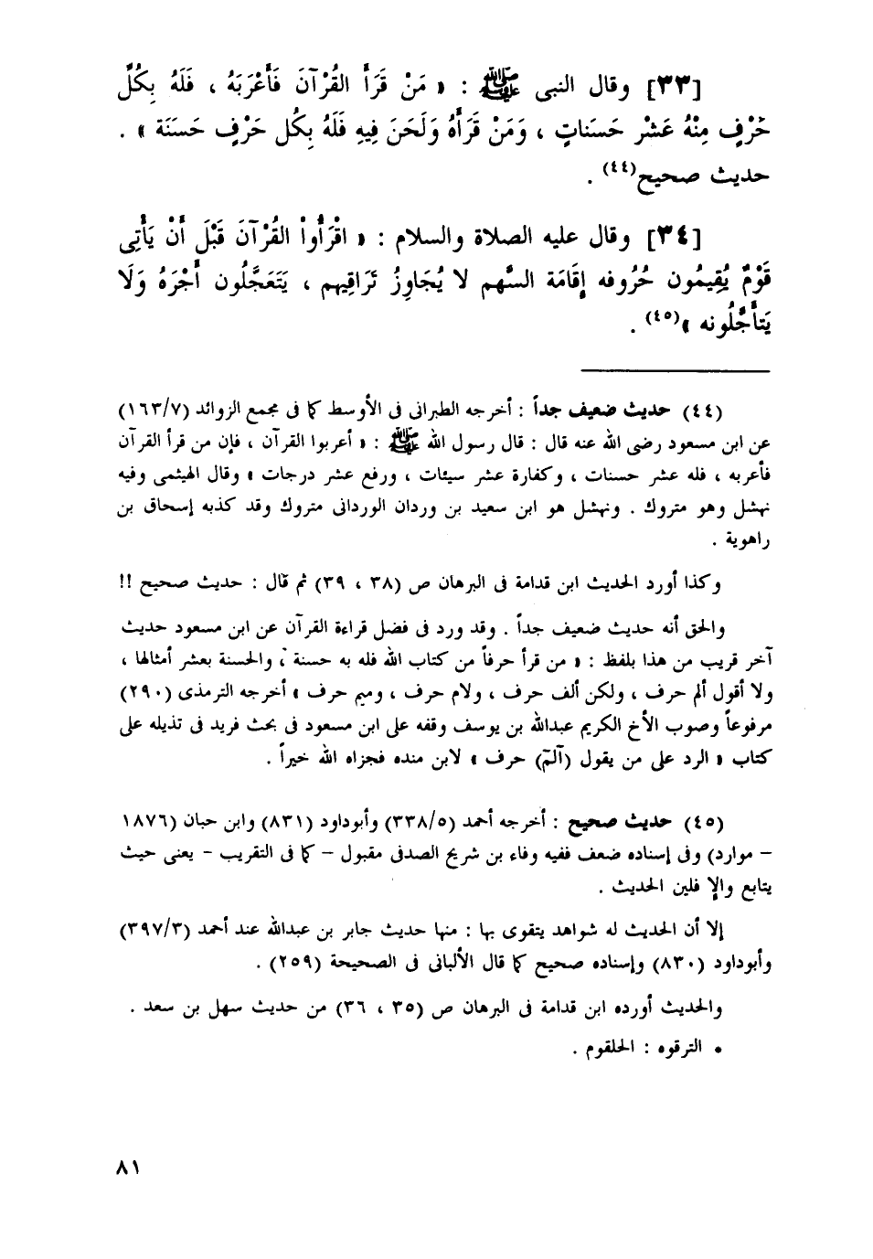 [33] وقال النبي صلى الله عليه وسلم: "من قرأ القرآن فأعربه، فله بكل حرف منه عشر حسنات، ومن قرأه ولحن فيه فله بكل حرف حسنة". حديث صحيح44.