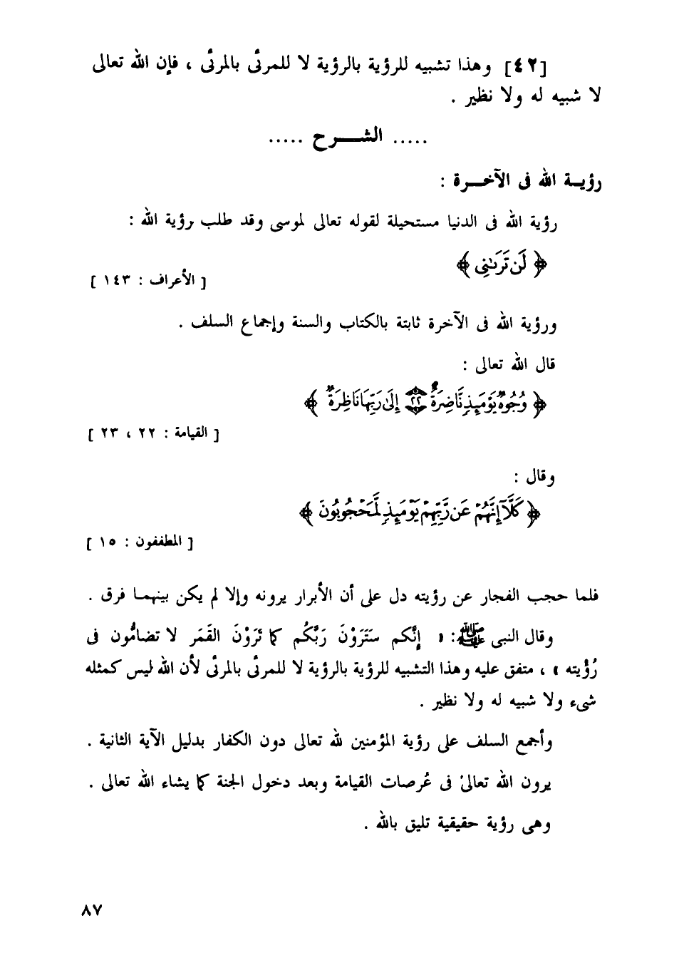 وقال النبي صلى الله عليه وسلم: "إنكم سترَوْنَ رَبَّكُم كّمَا تَرَوْنَ هَذَا القّمَرَ لا تُضَامُّون في رُؤْيِتَه". متفق عليه وهذا التشبيه للرؤية بالرؤية لا للمرئي بالمرئي؛ لأن الله ليس كمثله شيء ولا شبيه له ولا نظير.