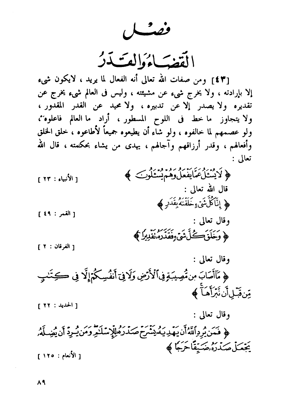 [43] ومن صفات الله تعالى أنه الفعال لما يريد، لا يكون شيء إلا بإرادته، ولا يخرج شيء عن مشيئته، وليس في العالم شيء يخرج عن تقديره ولا يصدر إلا عن تدبيره، ولا محيد عن القدر المقدور، ولا يتجاوز ما خط في اللوح المسطور، أراد ما العالم فاعلوه، ولو عصمهم لما خالفوه، ولو شاء أن يطيعوه جميعًا لأطاعوه، خلق الخلق وأفعالهم، وقدر أرزاقهم وآجالهم، يهدي من يشاء بحكمته، قال الله تعالى: {لا يُسْأَلُ عَمَّا يَفْعَلُ وَهُمْ يُسْأَلُونَ} [الأنبياء: 23] .