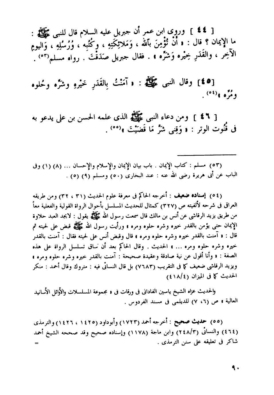 54 إسناده ضعيف: أخرجه الحاكم في معرفة علوم الحديث "31، 32" ومن طريقه العراقي في شرحه لألفيته ص "327" كمثال للحديث المسلسل بأحوال الرواة القولية والفعلية معا من طريق يزيد الرقاشي عن أنس بن مالك قال: سمعت رسول الله -صلى الله عليه وسلم- يقول: "لا يجد العبد حلاوة الإيمان حتى يؤمن بالقدر خيره وشره حلوه ومره" ورأيت رسول الله -صلى الله عليه وسلم- قبض على لحيته ثم قال: "آمنت بالقدر خيره وشره حلوه ومره" قال: وقبض أنس على لحيته فقال: آمنت بالقدر خيره وشره حلوه ومره ... الحديث. وقال الحاكم بعد أن ساق تسلسل الرواة على هذه الصفة: وأنا أقول عن نية صادقة وعقيدة صحيحة: آمنت بالقدر خيره وشره حلوه ومره, ويزيد الرقاشي ضعيف كما في التقريب "7683" بل قال النسائي فيه: متروك وقال أحمد: منكر الحديث كما في الميزان "418/4".