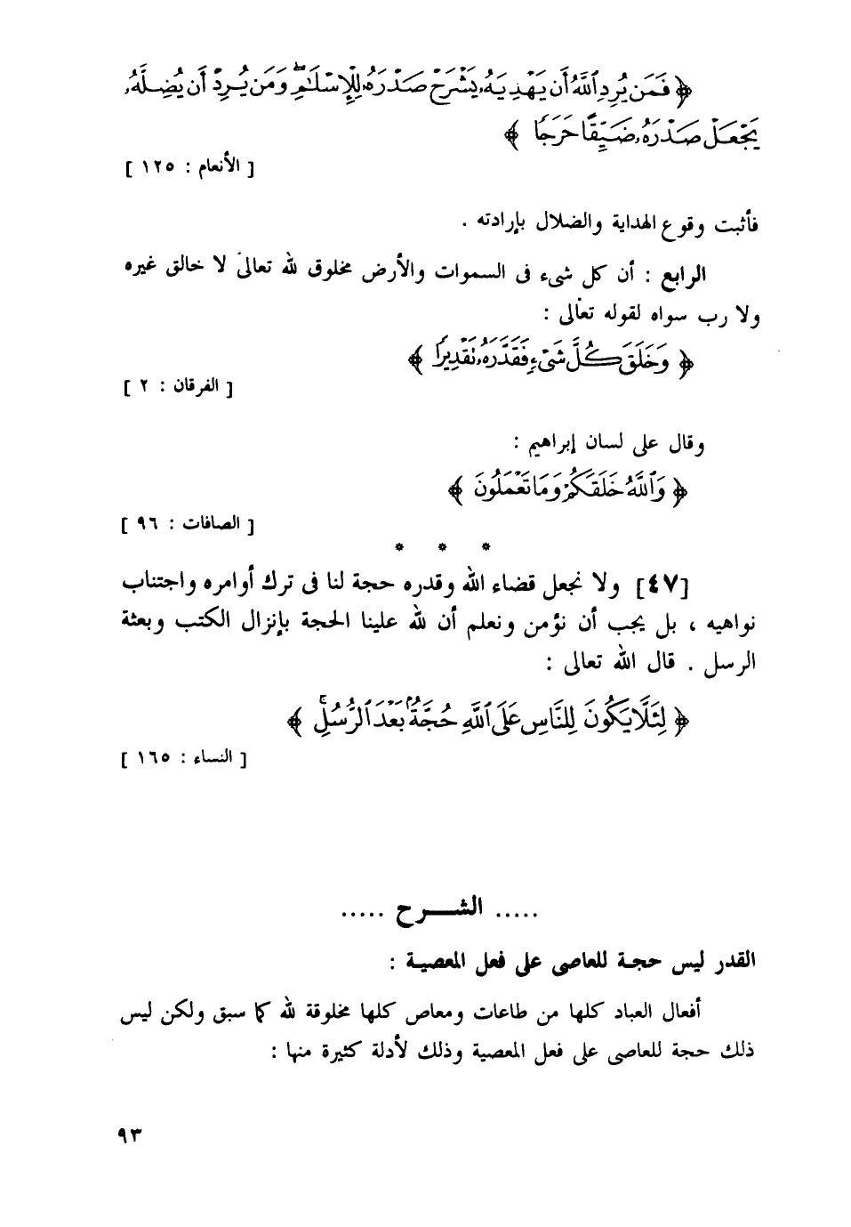 [47] ولا نجعل قضاء الله وقدره حجة لنا في ترك أوامره واجتناب نواهيه، بل يجب أن نؤمن ونعلم أن لله علينا الحجة بإنزال الكتب وبعثة الرسل. قال الله تعالى:
