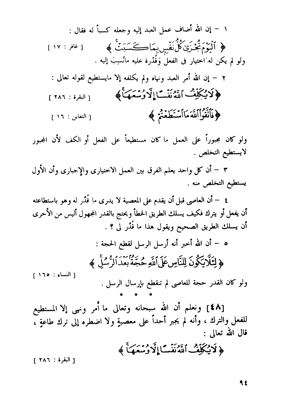 [48] ونعلم أن الله سبحانه وتعالى ما أمر ونهى إلا المستطيع للفعل والترك، وأنه لم يجبر على معصية ولا اضطره إلى ترك طاعةٍ، قال الله تعالى: