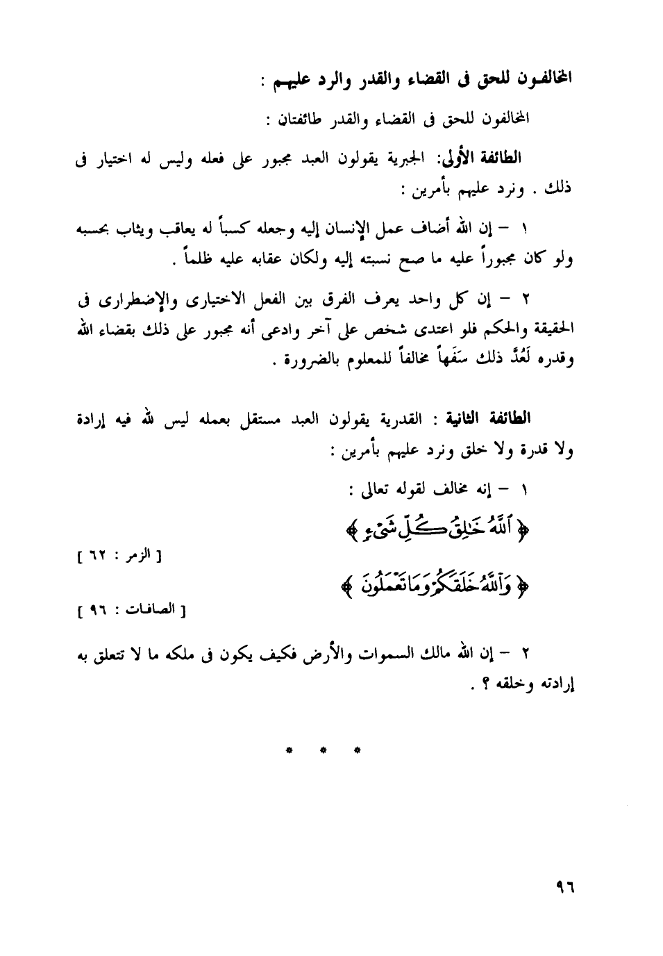 الطائفة الثانية: القدرية، يقولون: العبد مستقل بعمله ليس لله فيه إرادة ولا قدرة ولا خلق ونرد عليهم بأمرين: