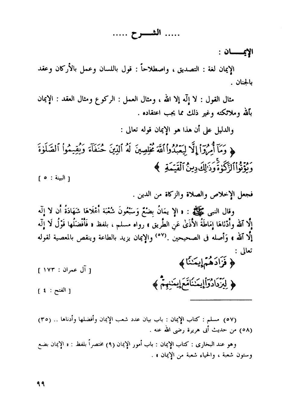 وقال النبي صلى الله عليه وسلم: "الإيمان بضع وسبعون شعبة أعلاها شهادة أن لا إله إلا الله وأدناها إماطة الأذى عن الطريق" رواه مسلم، بلفظ "فأفضلها قول لا إله إلا الله" وأصله في الصحيحين57. والإيمان يزيد بالطاعة وينقص بالمعصية لقوله تعالى: