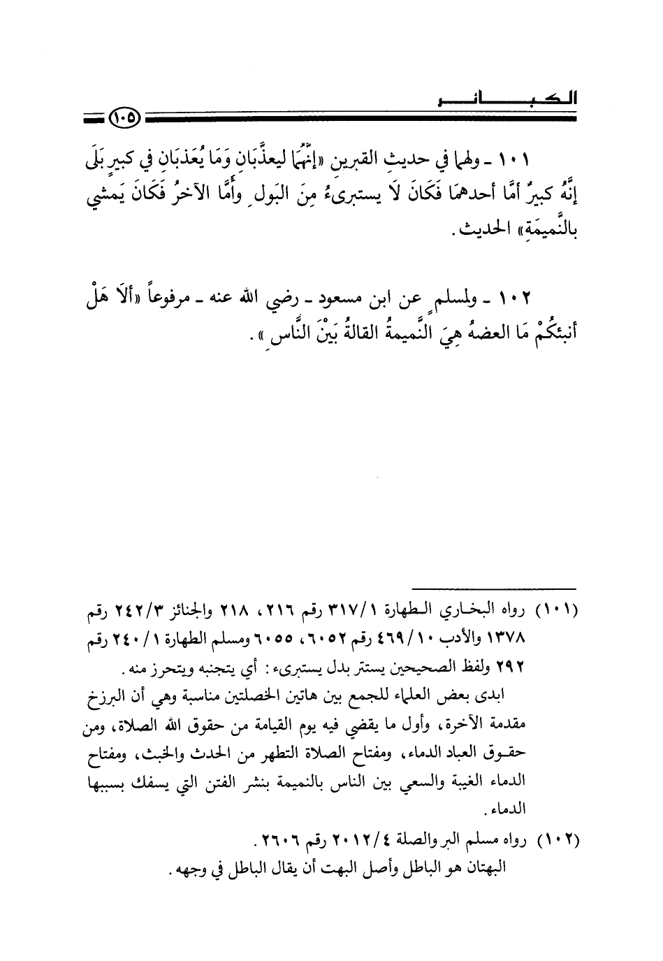 101 - ولهما في حديث القبرين «إنهما ليعذبان وما يعذبان في كبير بلى إنه كبير أما أحدهما فكان لا يستبرئ من البول وأما الآخر فكان يمشي بالنميمة» الحديث.