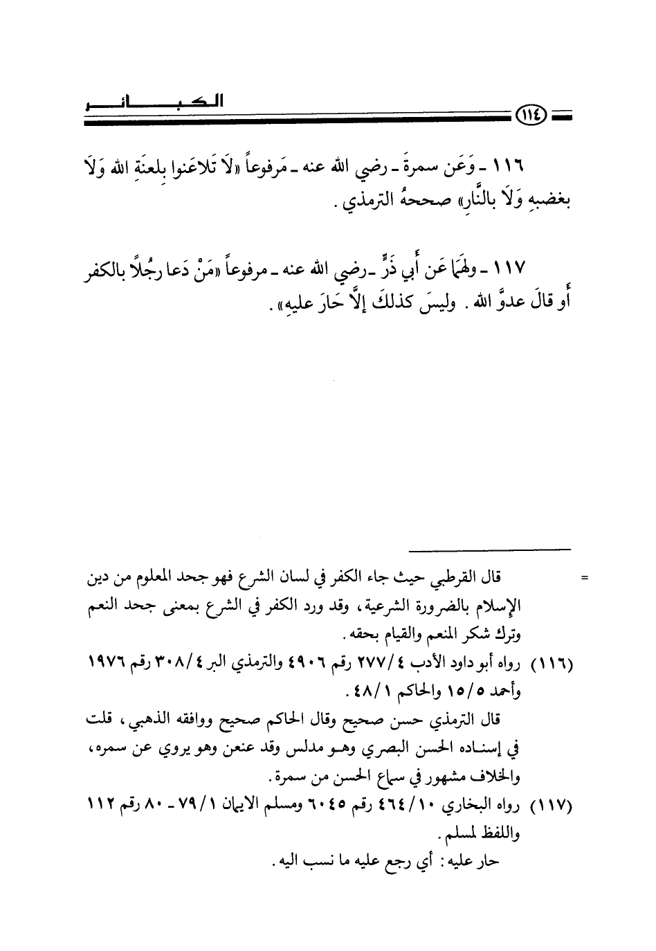 117 - ولهما عن أبي ذر - رضي الله عنه - مرفوعا «من دعا رجلا بالكفر أو قال عدو الله. وليس كذلك إلا حار عليه ".»