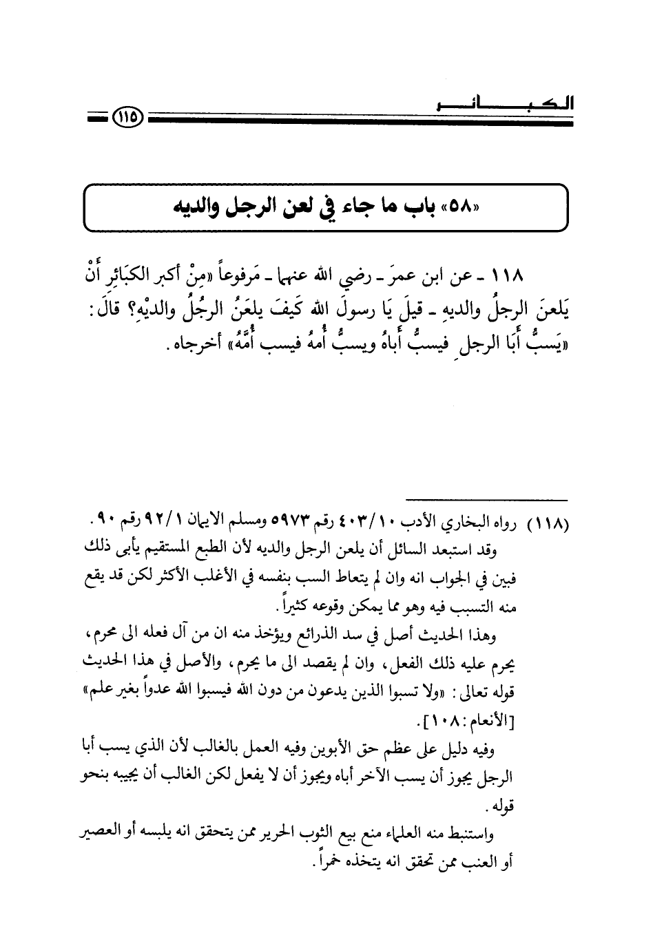 118 - عن ابن عمر - رضي الله عنهما - مرفوعا «من أكبر الكبائر أن يلعن الرجل والديه - قيل يا رسول كيف يلعن الرجل والديه؟ قال: " يسب أبا الرجل فيسب أباه ويسب أمه فيسب أمه» أخرجاه.