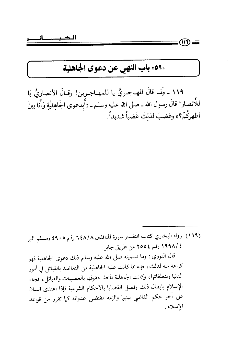 119 - «ولما قال المهاجري يا للمهاجرين! وقال الأنصاري يا للأنصار! قال رسول الله - صلى الله عليه وسلم - " أبدعوى الجاهلية وأنا بين أظهركم؟ " وغضب لذلك غضبا شديدا» .