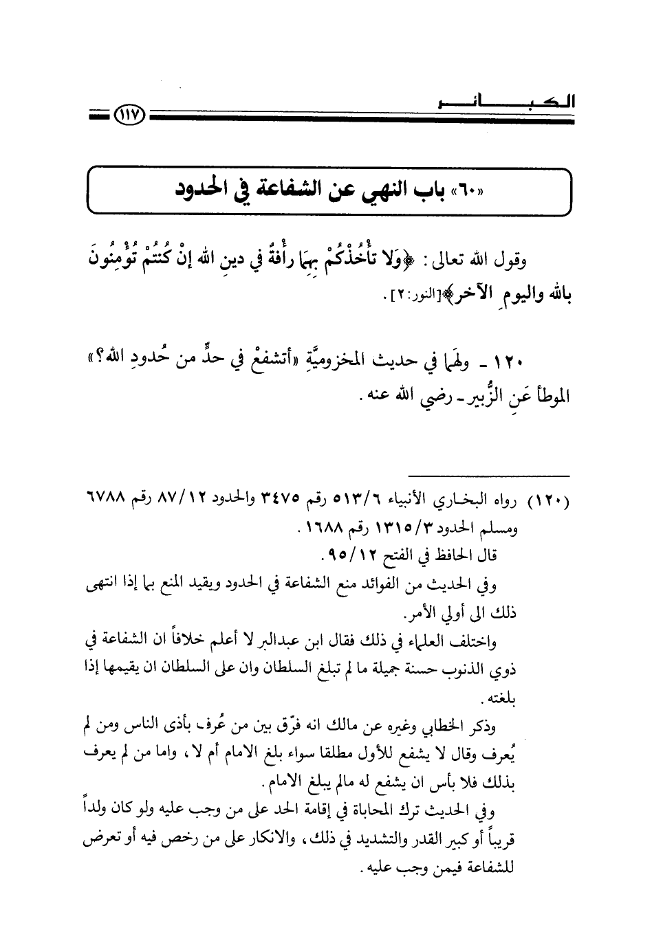 " 60 " باب النهي عن الشفاعة في الحدود وقول الله تعالى: {وَلَا تَأْخُذْكُمْ بِهِمَا رَأْفَةٌ فِي دِينِ اللَّهِ إِنْ كُنْتُمْ تُؤْمِنُونَ بِاللَّهِ وَالْيَوْمِ الْآخِرِ}