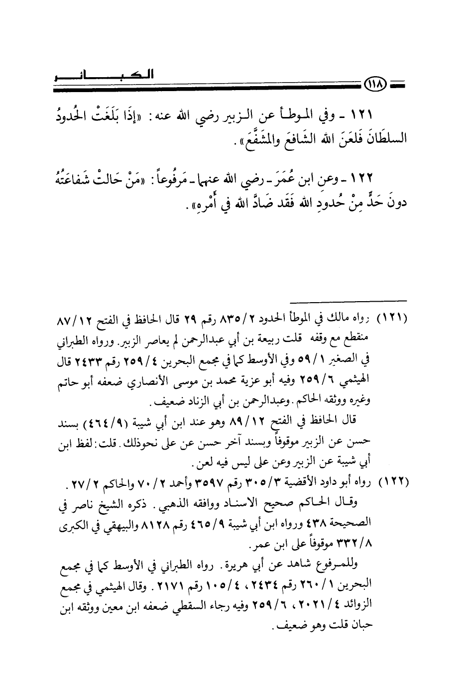 121 - وفي الموطأ عن الزبير رضي الله عنه: «إذا بلغت الحدود السلطان فلعن الله الشافع والمشفع» .