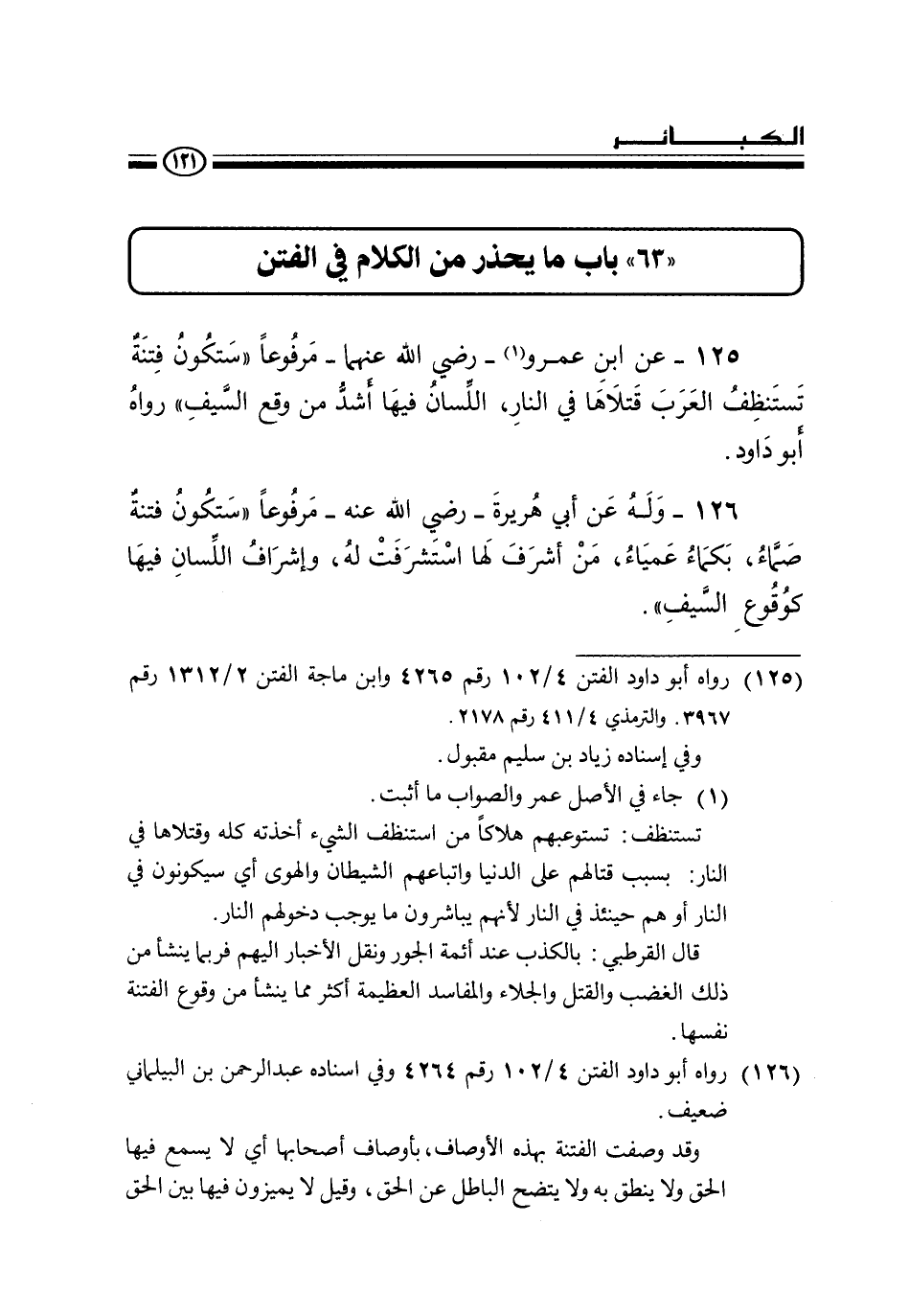 125 - عن ابن عمرو (¬1) - رضي الله عنهما - مرفوعا «ستكون فتنة تستنظف العرب قتلاها في النار، اللسان فيها أشد من وقع السيف» رواه أبو داود.