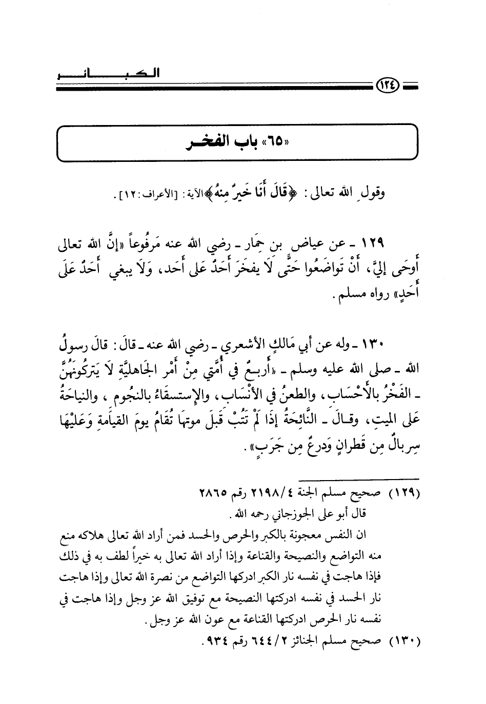 129 - عن عياض بن حمار - رضي الله عنه - مرفوعا «إن الله تعالى أوحى إلي، أن تواضعوا حتى لا يفخر أحد على أحد، ولا يبغي أحد على أحد» رواه مسلم.